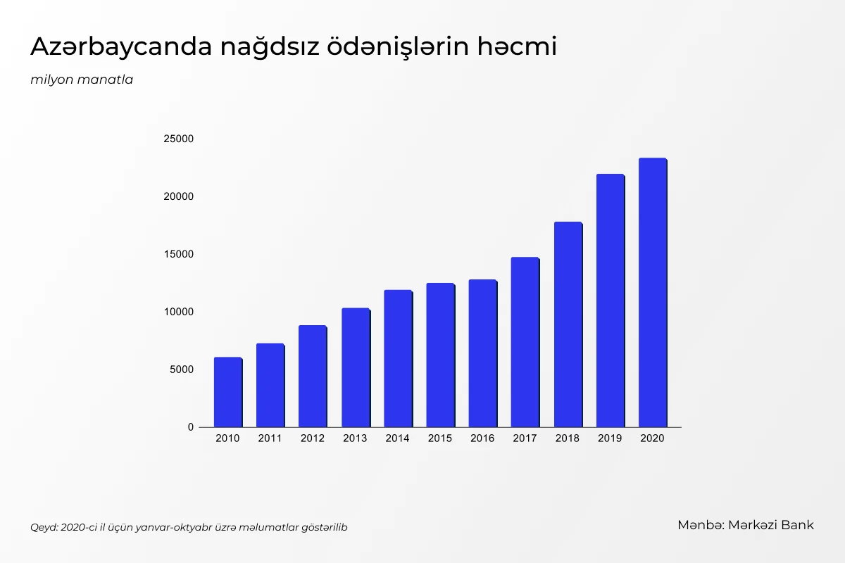 Azərbaycanda da nağdsız ödənişlərin payı getdikcə artır. AMB-nin məlumatına görə cari ilin yanvar – oktyabr aylarında belə əməliyyatların sayı 182 milyonu, həcmi isə 23,3 milyard manatı keçib.