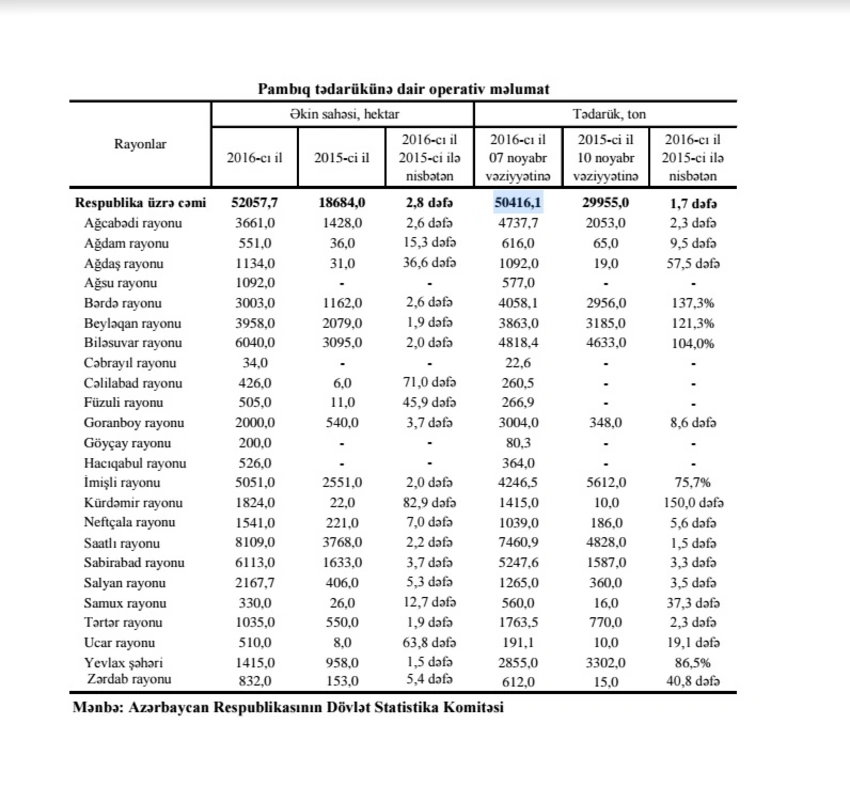 Azərbaycanda pambıq yığımı 2,8 dəfə artıb - CƏDVƏL