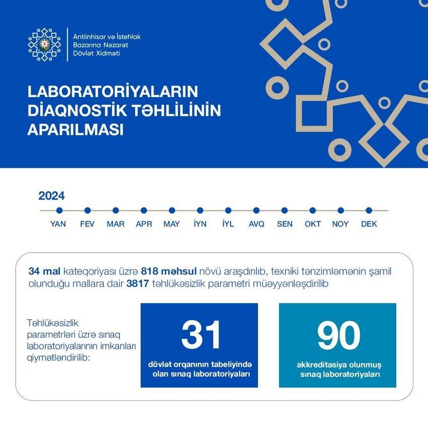 Onun sözlərinə görə, qurum laboratoriyaların milli və beynəlxalq standartlara uyğun fəaliyyətinin təşkil edilməsi məqsədilə diaqnostik qiymətləndirmələr aparıb. Təhlillər əsasında qabaqcıl texniki reqlamentlər, qaydalar və istinad standartları nəzərə alınıb. Müəyyən edilmiş təhlükəsizlik parametrləri üzrə 31 dövlət orqanının tabeliyində olan və akkreditasiya olunmuş 90 sınaq laboratoriyasının imkanları qiymətləndirilib.