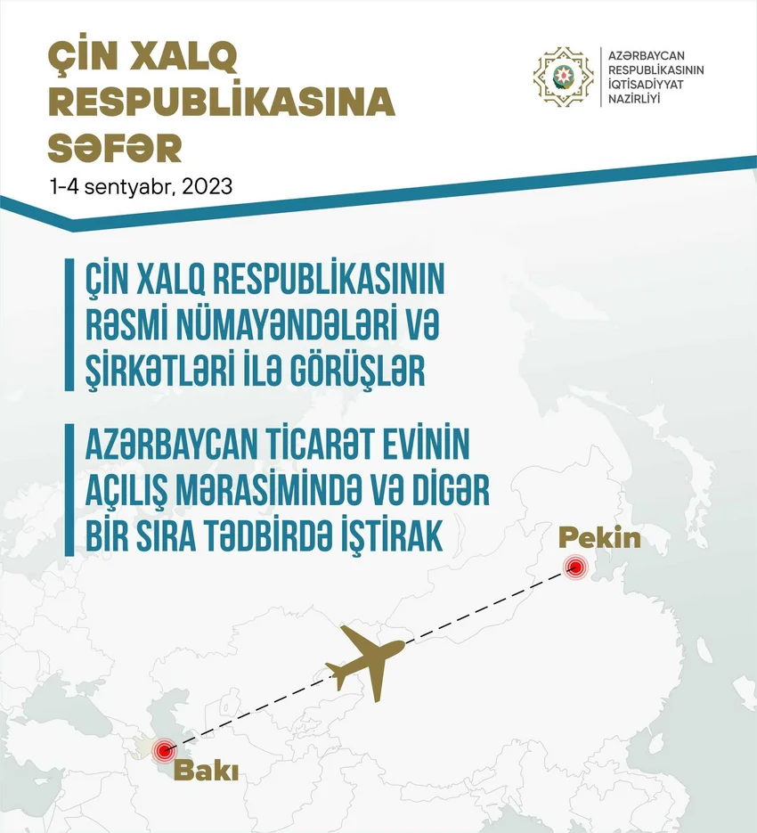 "Həmkarlarla birgə Çin Xalq Respublikasına səfərimiz çərçivəsində bir sıra rəsmi nümayəndələr və şirkət rəhbərləri ilə görüşlər keçirəcəyik. Pekində Azərbaycan Ticarət Evinin açılış mərasimində və digər tədbirlərdə iştirak edəcəyik", - nazir qeyd edib.