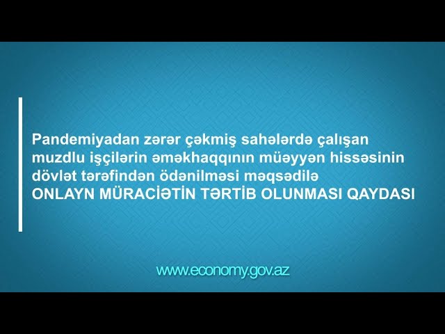 1. Pandemiyadan zərər çəkən sahələrdə fəaliyyət göstərən vergi ödəyicilərinin muzdlu işçilərinin əməkhaqqının müəyyən hissəsinin ödənilməsi üçün müraciətin tərtib olunması qaydasını izah edən videotəlimat;