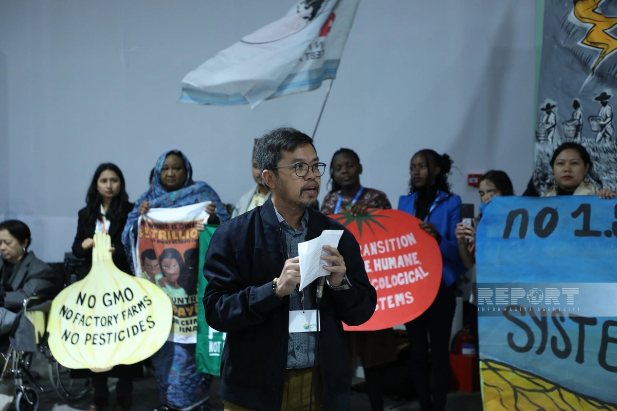"Qlobal Şimal inkişaf etməkdə olan ölkələrdə kənd təsərrüfatı sisteminin dağıdılmasının əvəzini verməlidir ", "GMO-ya yox, Sənaye fermalarına yox, Pestisidlərə yox" - plakatlarda yazılıb.