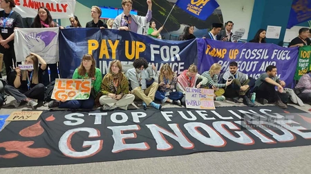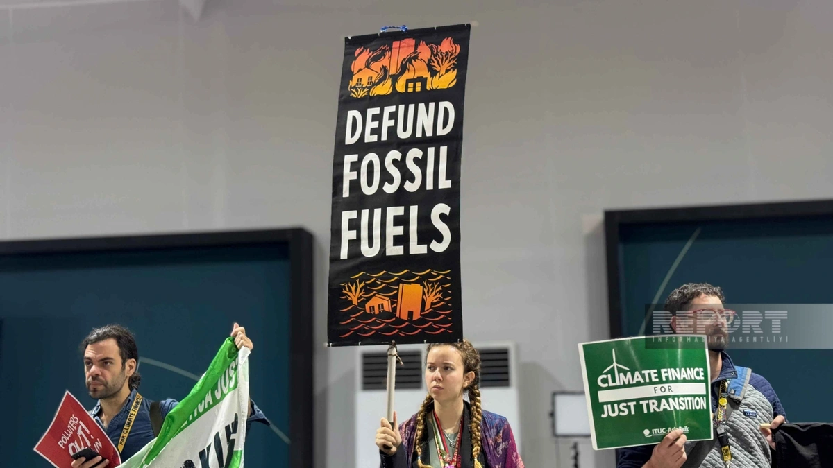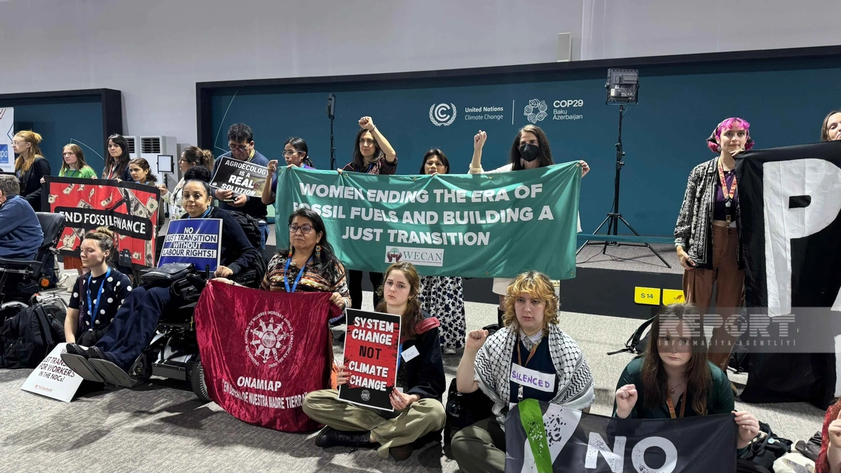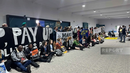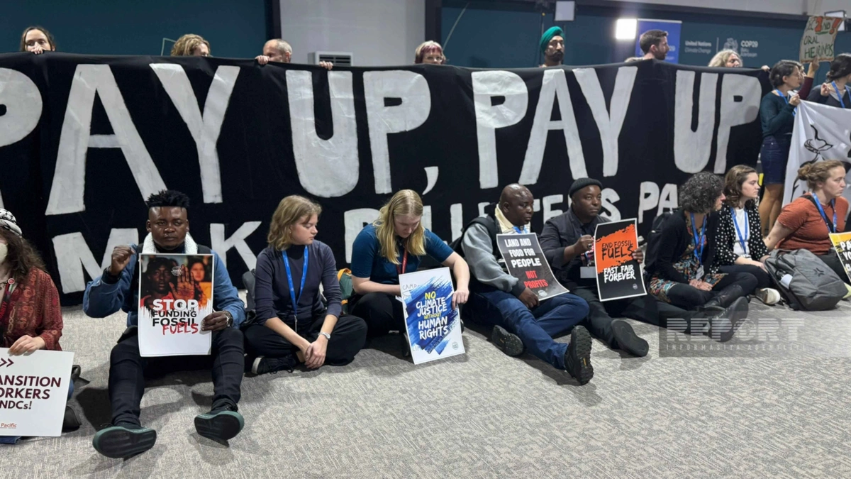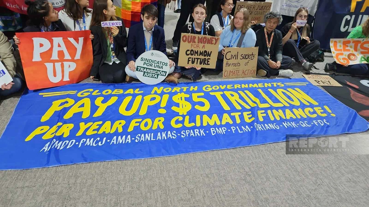 “Report” xəbər verir ki, aksiya iştirakçıları öz mövqelərini sözsüz ifadə ediblər: onlar iqlim dəyişikliyi ilə mübarizə üzrə maliyyə öhdəliklərinin yerinə yetirilməsini tələb edərək "Pay up" şüarı olan pankart açıblar.