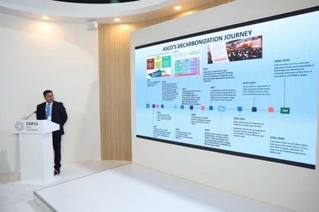 ASCO-nun İdarə Heyətinin sədri Rauf Vəliyev Azərbaycanın dünyanın ən böyük tədbiri sayılan COP29-a ev sahibliyi etməsinin tarixi hadisə olduğunu diqqətə çatdırıb. O, ASCO-nun dekorbanizasiya istiqamətində gördüyü işlər və strateji hədəfləri barədə məlumat verib: "ASCO 2012-ci illə müqayisədə emissiyaların 20 % azaldılmasına nail olub. Bu da Beynəlxalq Dəniz Təşkilatının (IMO) 2030-cu il hədəfinin vaxtından əvvəl yerinə yetirilməsi deməkdir. Bu uğuru əldə etmək asan olmadı. Ancaq bunu yeni gəmilərə investisiya yatıraraq, mövcud gəmiləri yenidən təmir edərək, köhnə gəmiləri istismardan çıxararaq və enerji səmərəliliyini artıraraq əldə etdik. Məqsədimiz IMO-nun 2050-ci ilədək sıfır emissiya hədəfinə nail olmaqdır və biz bunun üçün dayanıqlılıq həllərini inkişaf etdirmə və karbon emissiyalarının azaldılması strategiyalarını araşdırmaq istiqamətində aktiv fəaliyyət göstəririk”.