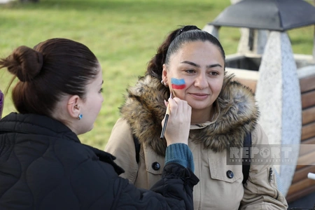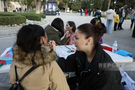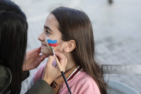 Aksiya zamanı bayram abu-havası yaratmaq məqsədilə uşaqların üzləri (Face art) Azərbaycan bayrağının rənglərində boyanıb.