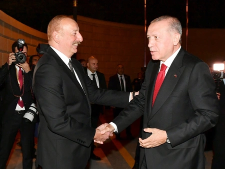 "Report" xəbər verir ki, Azərbaycan Prezidenti İlham Əliyev və birinci xanım Mehriban Əliyeva Türkiyə Prezidenti Rəcəb Tayyib Ərdoğanı və birinci xanım Əminə Ərdoğanı qarşıladılar.