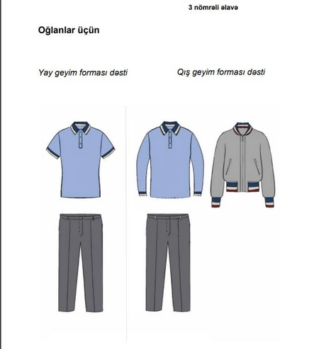 Geyim forması dəsti məktəbin Pedaqoji Şurasının qərarı ilə ən geci martın 1-dək müəyyən olunur və ən azı 3 tədris ili ərzində dəyişilməz olaraq tətbiq edilir.