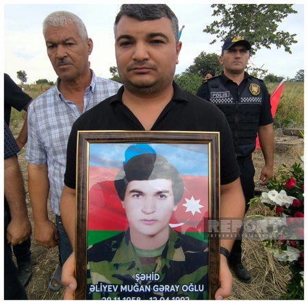 Qalıqları aşkar edilən Birinci Qarabağ müharibəsində itkin düşmüş hesab olunan şəhid Muğan Gəray oğlu Əliyevin nəşi Füzuli rayonuna gətirilib.