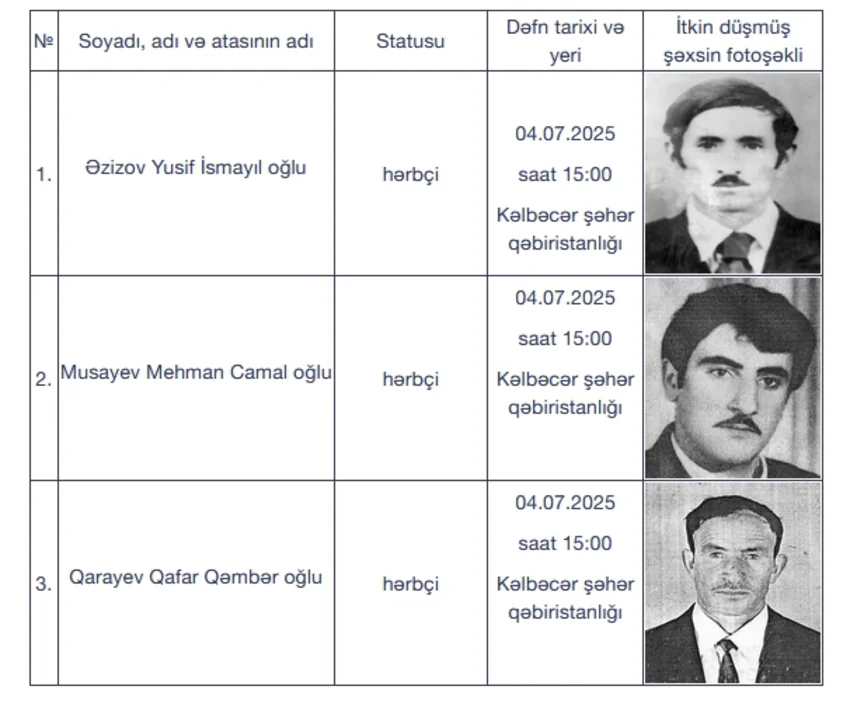 Nəşlərin qalıqları iyulun 4-ü saat 15.00-da Kəlbəcər şəhər qəbiristanlığında dəfn olunacaq.