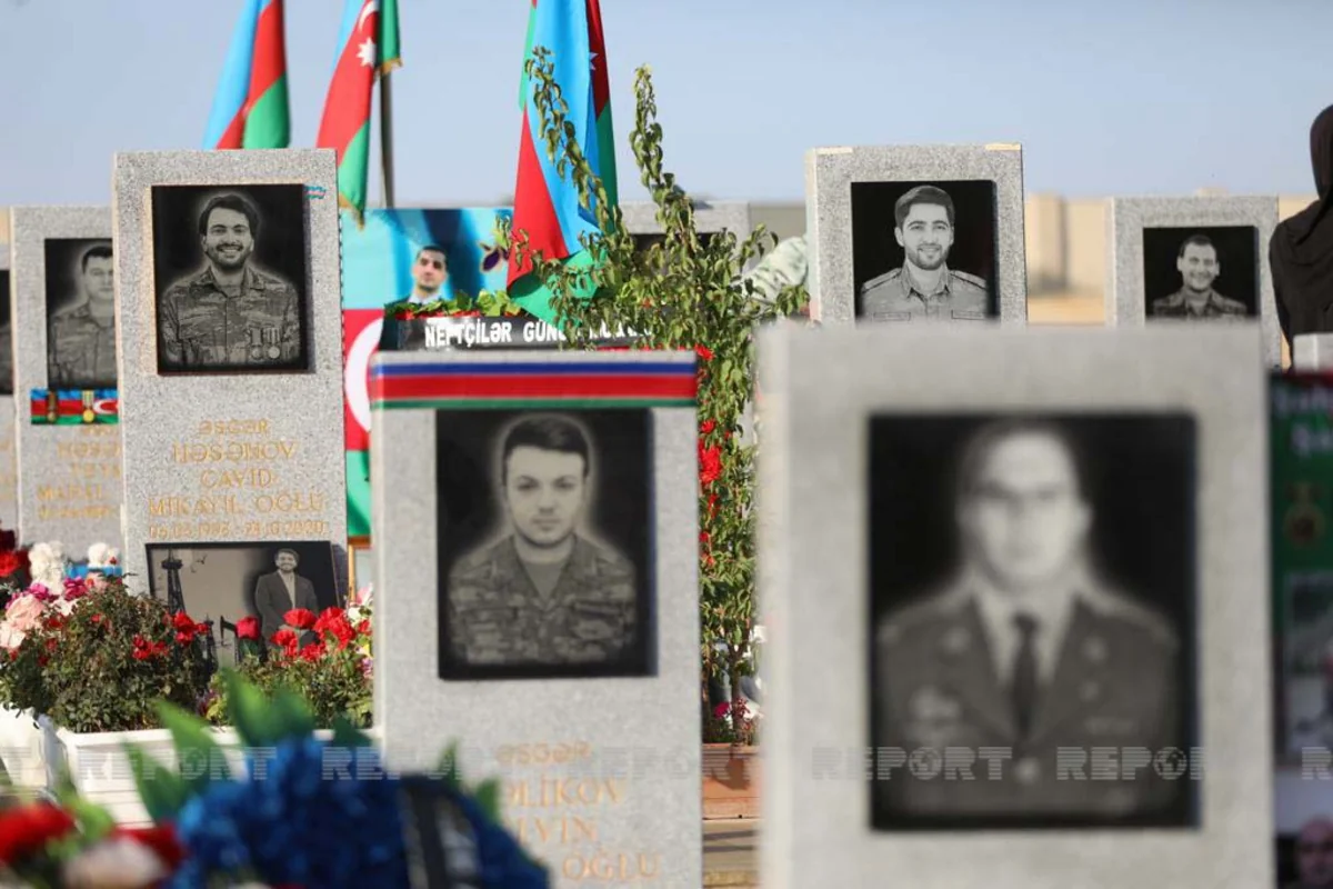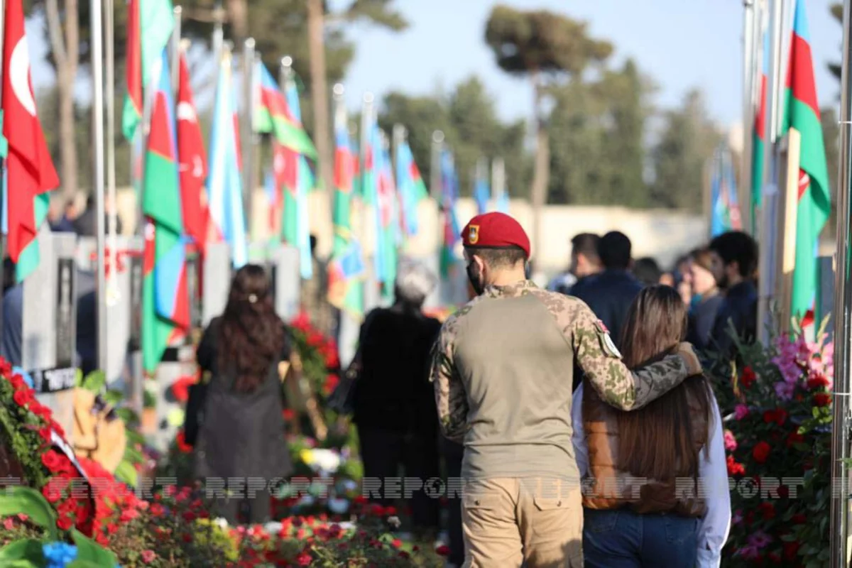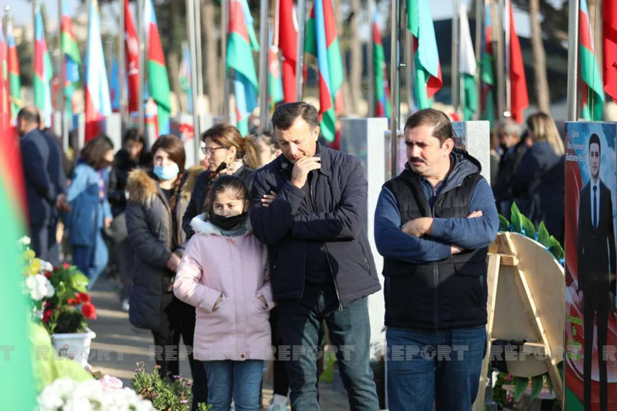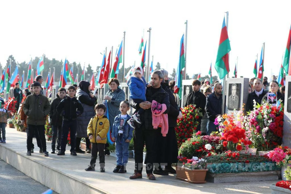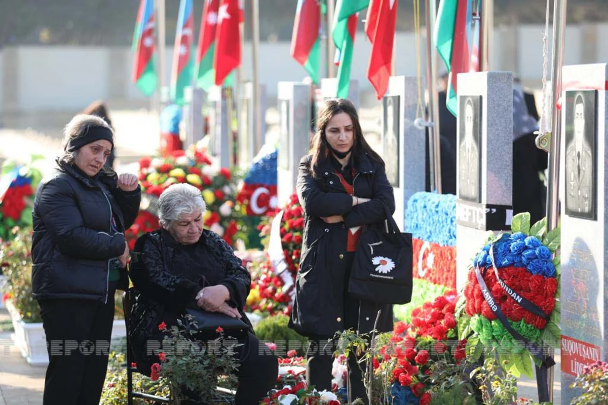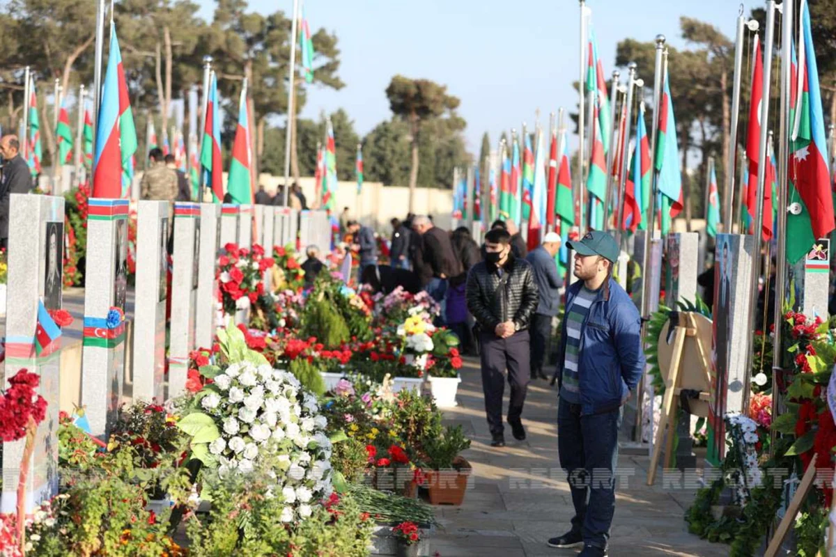 Ziyarətçilər şəhidlərin xatirəsinə dualar oxuyur və məzarları üzərinə gül dəstələri düzürlər.