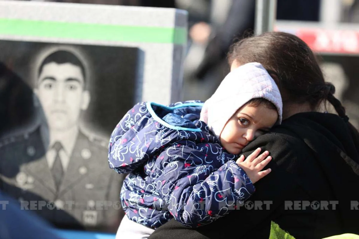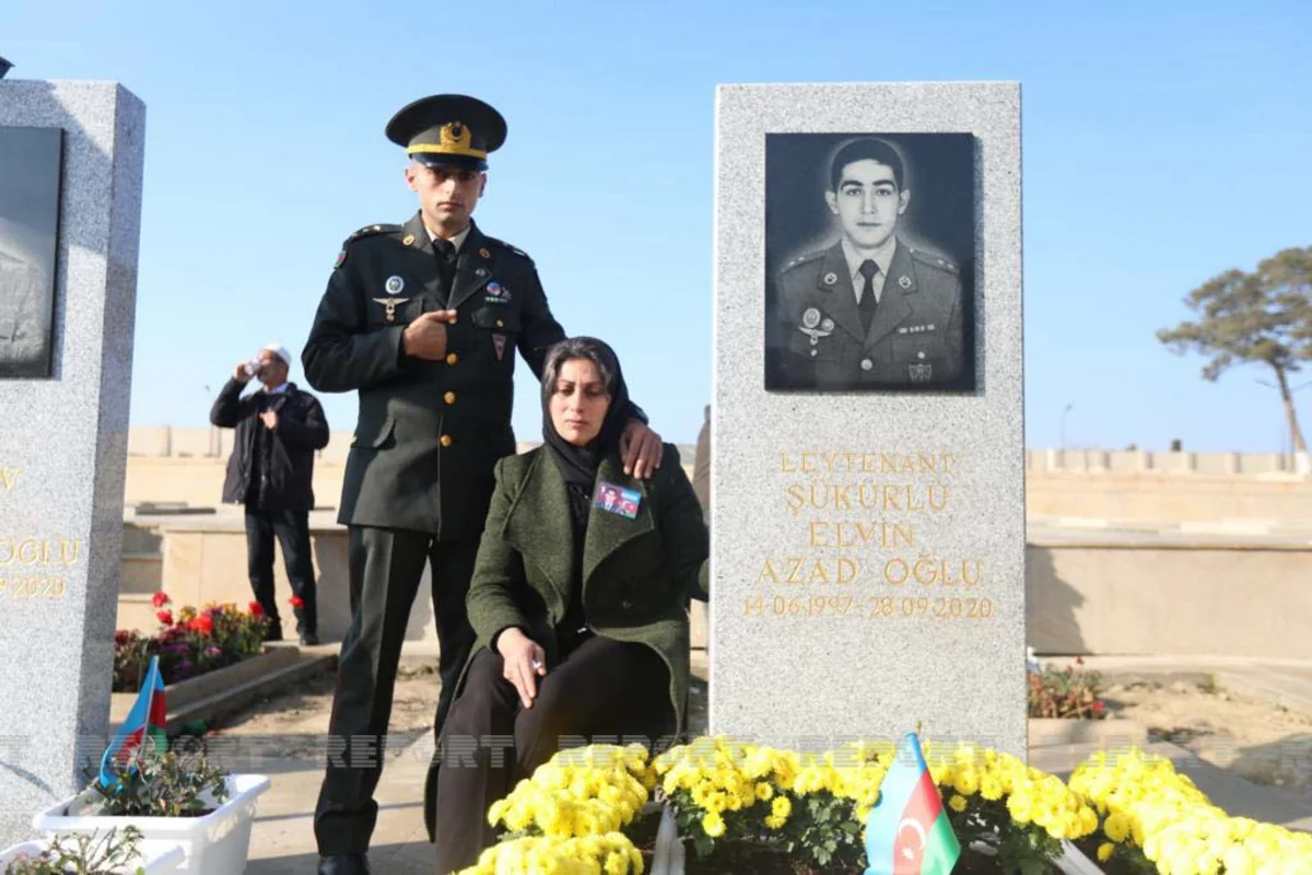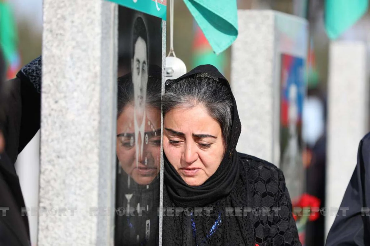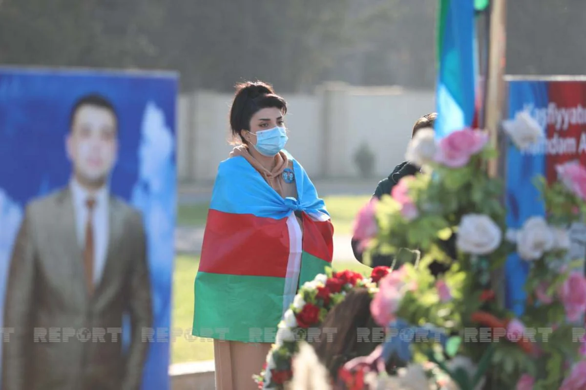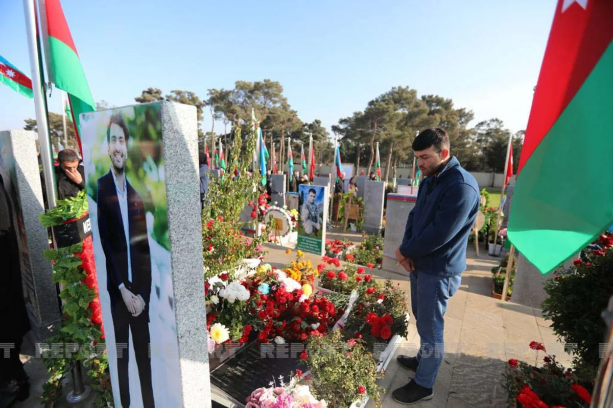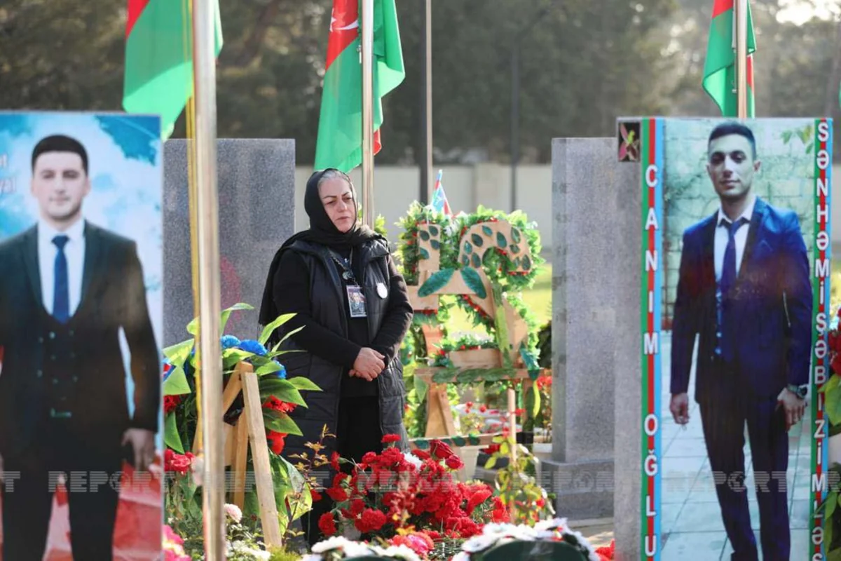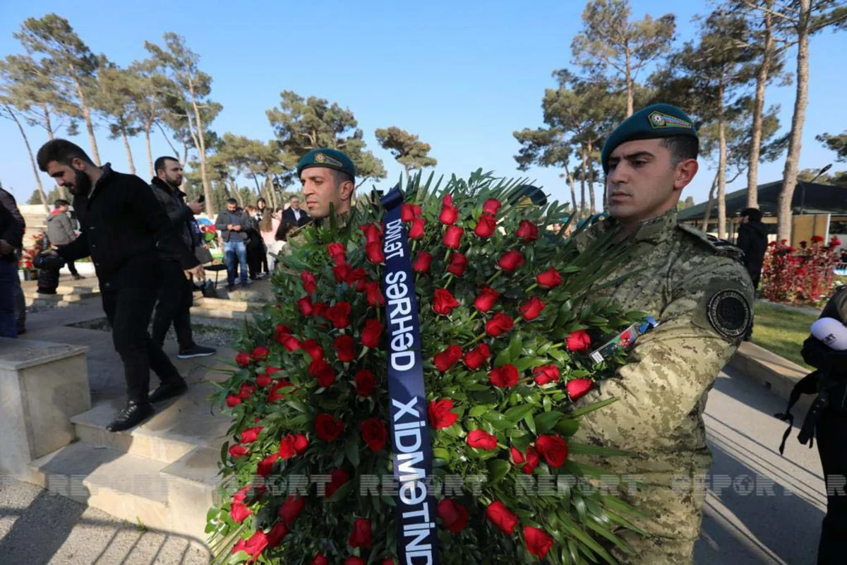 Ziyarətçilər şəhidlərin xatirəsinə dualar oxuyur və məzarları üzərinə gül dəstələri düzürlər.