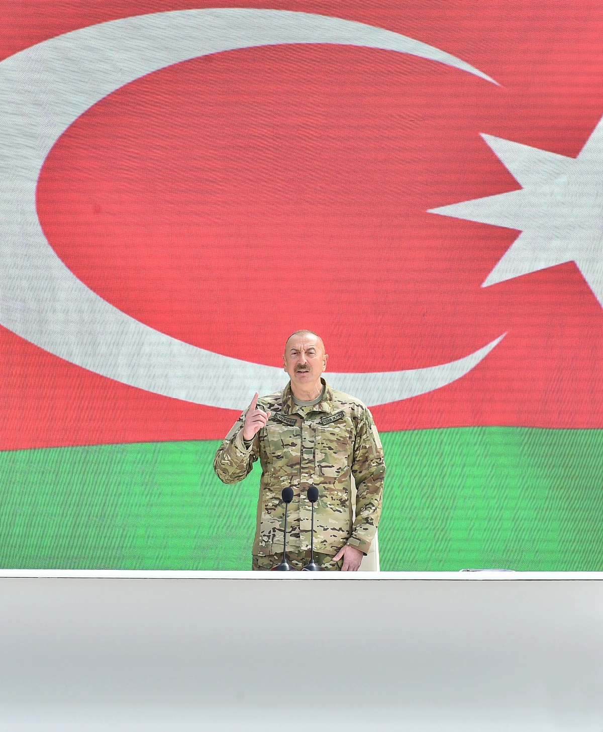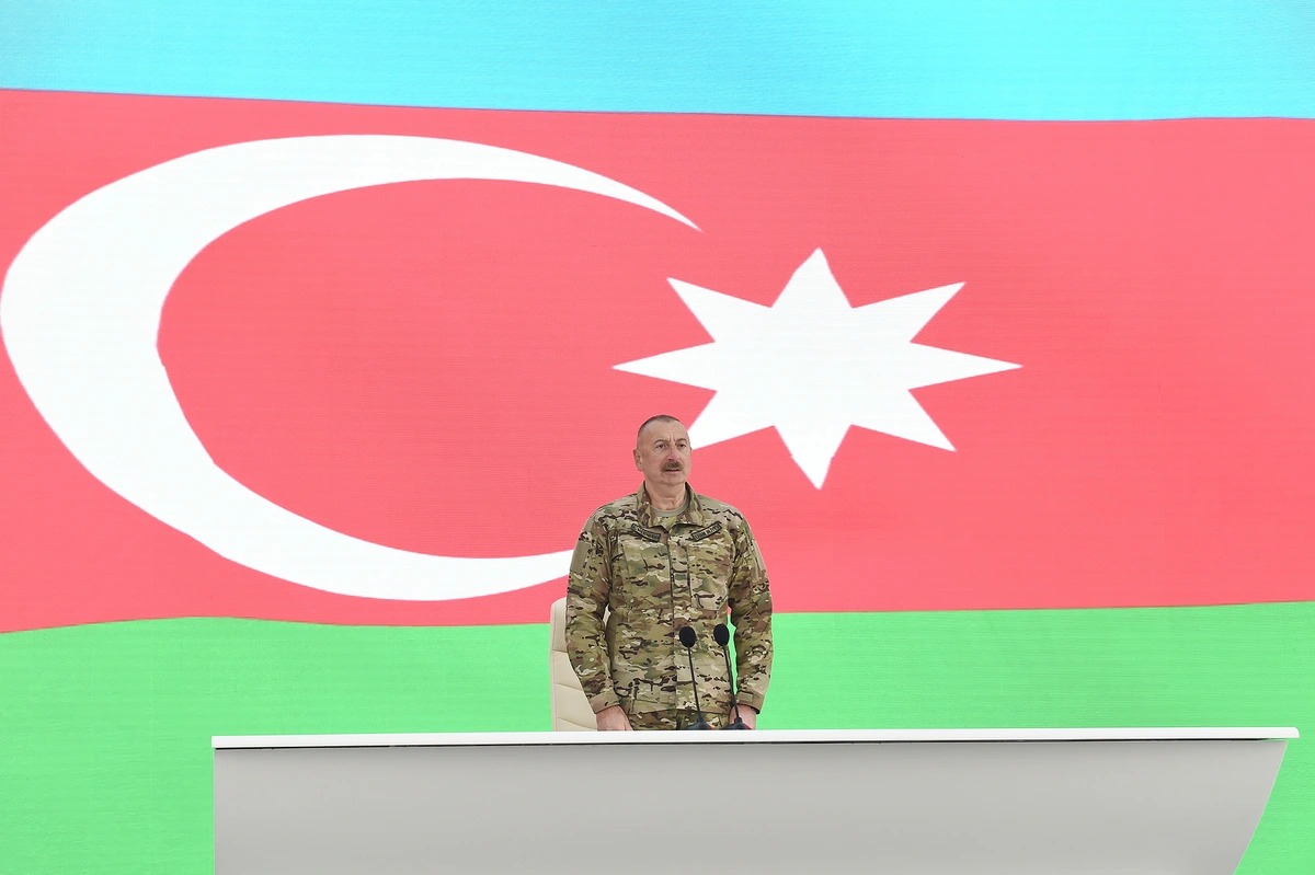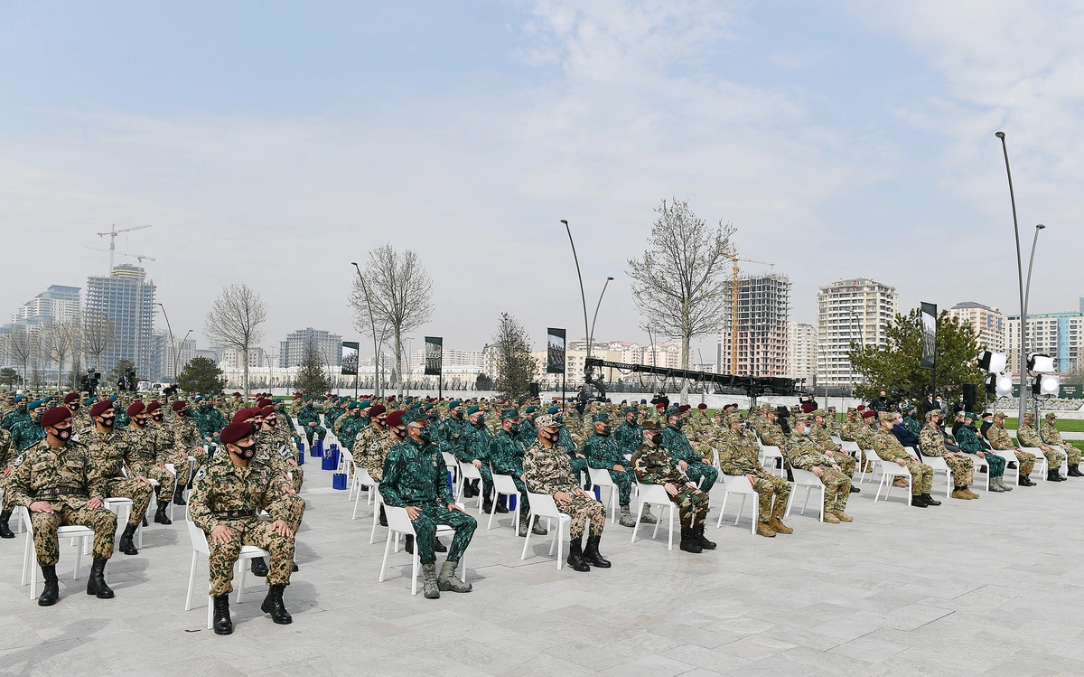 Bugünkü təntənəli mərasimin yeri təsadüfən seçilmədi. Biz bu mərasimi Yeni Bulvarda keçiririk. Yeni Bulvar mənim təşəbbüsümlə bir neçə il bundan əvvəl salınmışdır. Yeni Bulvarın uzunluğu 12 kilometrdir. Müqayisə üçün deyə bilərəm ki, köhnə bulvarın uzunluğu cəmi 3 kilometrdir. Bu bulvarın salınması dövlətimizin qüdrətini göstərirdi, xalqa olan qayğını göstərirdi. Bu, yenilik idi, inkişaf idi, bu, bizim gücümüzün təzahürü idi. İkinci Qarabağ müharibəsi də bizim gücümüzü göstərdi, müasirliyi göstərdi. Çünki biz XXI əsrin müharibəsini aparmışıq və bu gün artıq sirr deyil ki, dünyanın aparıcı hərbi məktəblərində İkinci Qarabağ müharibəsindəki əməliyyatlarımız, bizim uğurlarımız, Qələbəmiz öyrənilir. Dünya mətbuatında artıq dəfələrlə məlumat verilmişdir ki, dünyanın aparıcı ölkələri, o cümlədən Amerika Birləşmiş Ştatları, Böyük Britaniya, Almaniya və inkişaf etmiş digər ölkələr İkinci Qarabağ müharibəsinin bütün aspektlərini öyrənirlər. Öz ordularını müasir standartlara, müasir tələblərə uyğunlaşdırmaq istəyirlər. Biz nəinki XXI əsrin müharibəsini nümayiş etdirmişik, biz dünyada heç vaxt olmayan Qələbəni qazanmışıq. Çətin relyef şəraitində düşmənin bir neçə istehkamının qarşısında biz peşəkarlıq, məharət, güc, hərbi elm qoyduq və istədiyimizə nail olduq, düşməni torpaqlarımızdan qovduq.