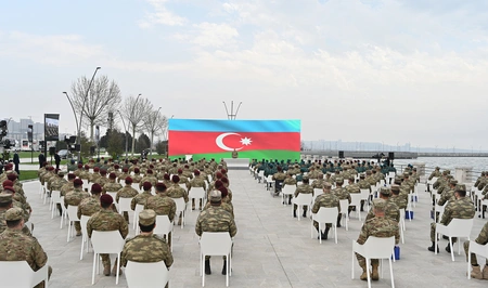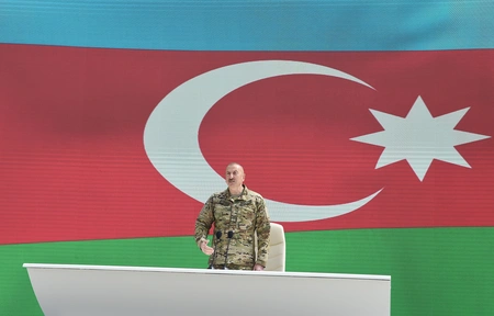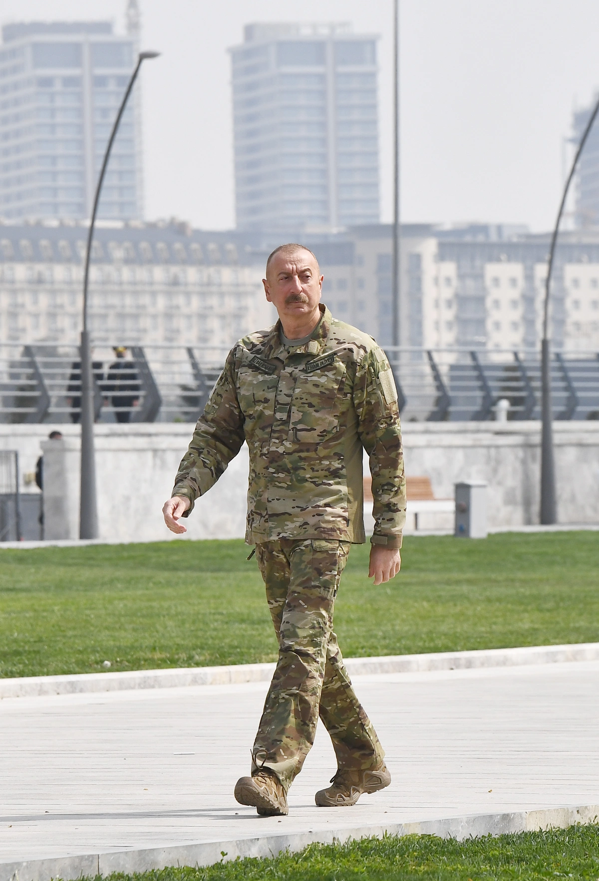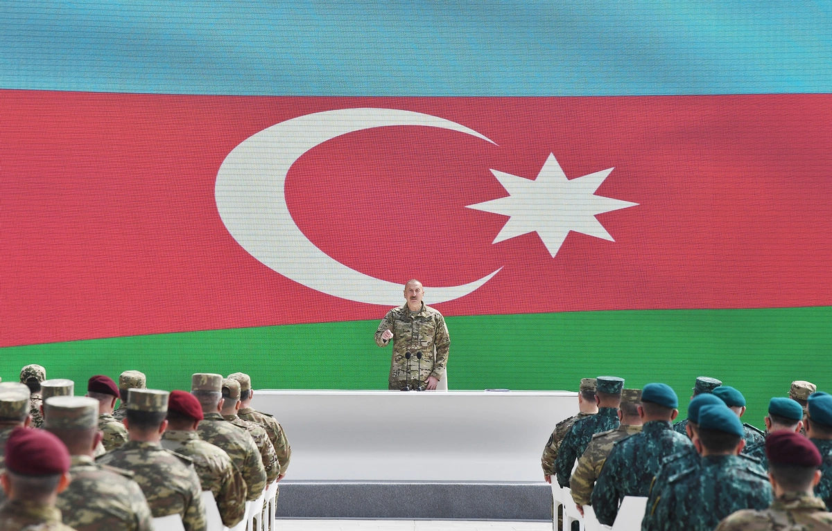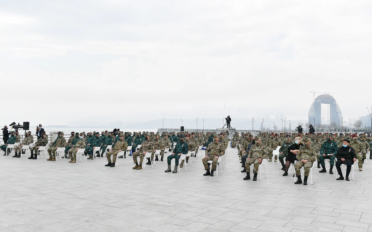 Bugünkü təntənəli mərasimin yeri təsadüfən seçilmədi. Biz bu mərasimi Yeni Bulvarda keçiririk. Yeni Bulvar mənim təşəbbüsümlə bir neçə il bundan əvvəl salınmışdır. Yeni Bulvarın uzunluğu 12 kilometrdir. Müqayisə üçün deyə bilərəm ki, köhnə bulvarın uzunluğu cəmi 3 kilometrdir. Bu bulvarın salınması dövlətimizin qüdrətini göstərirdi, xalqa olan qayğını göstərirdi. Bu, yenilik idi, inkişaf idi, bu, bizim gücümüzün təzahürü idi. İkinci Qarabağ müharibəsi də bizim gücümüzü göstərdi, müasirliyi göstərdi. Çünki biz XXI əsrin müharibəsini aparmışıq və bu gün artıq sirr deyil ki, dünyanın aparıcı hərbi məktəblərində İkinci Qarabağ müharibəsindəki əməliyyatlarımız, bizim uğurlarımız, Qələbəmiz öyrənilir. Dünya mətbuatında artıq dəfələrlə məlumat verilmişdir ki, dünyanın aparıcı ölkələri, o cümlədən Amerika Birləşmiş Ştatları, Böyük Britaniya, Almaniya və inkişaf etmiş digər ölkələr İkinci Qarabağ müharibəsinin bütün aspektlərini öyrənirlər. Öz ordularını müasir standartlara, müasir tələblərə uyğunlaşdırmaq istəyirlər. Biz nəinki XXI əsrin müharibəsini nümayiş etdirmişik, biz dünyada heç vaxt olmayan Qələbəni qazanmışıq. Çətin relyef şəraitində düşmənin bir neçə istehkamının qarşısında biz peşəkarlıq, məharət, güc, hərbi elm qoyduq və istədiyimizə nail olduq, düşməni torpaqlarımızdan qovduq.
