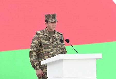 Bu gün mən və döyüşçü yoldaşlarım həyatımızın ən xoşbəxt, qürurlu anlarını yaşayırıq. Xalqımızın ümummilli lideri, ulu öndər Heydər Əliyevin özü qədər inandığı və gələcəyinə böyük ümidlər bəslədiyi Müzəffər Ali Baş Komandanımızın rəhbərlik etdiyi rəşadətli, qalib Azərbaycan Ordusunun əsgəri, zabiti olmaq həqiqətən də qürurvericidir. “Dəmir yumruq” əməliyyatı ilə başlayan Vətən müharibəsində biz qalib gəldik. Bu Qələbə dövlətimizin və ordumuzun qələbəsidir. Bu Qələbə xalqımızın birliyinin, vətənpərvərliyinin, həmrəyliyinin qələbəsidir. Bu Qələbə, cənab Prezident, şəxsən Sizin, Müzəffər Ali Baş Komandanımızın qələbəsidir.