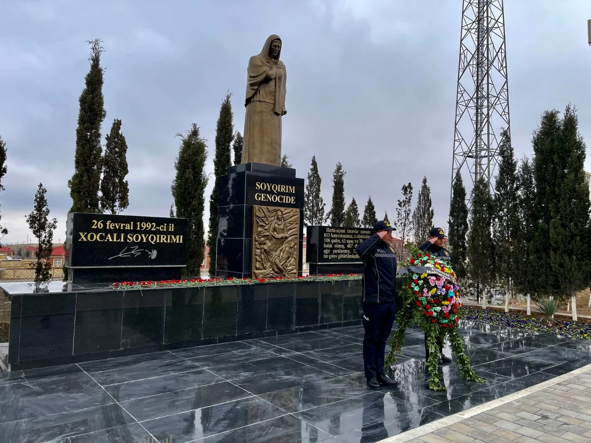 Mingəçevir şəhərində Şəhidlər xiyabanında soyqırımı abidəsi önünə əklil qoyub, gül düzüblər.