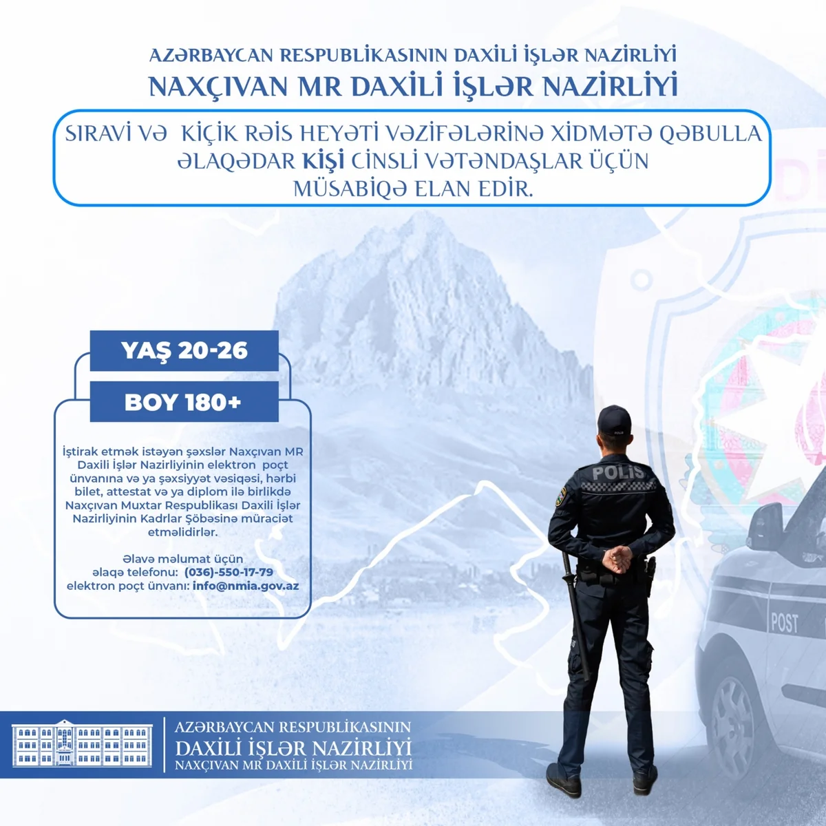 Naxçıvan Muxtar Respublikası Daxili İşlər Nazirliyində (DİN) vakant olan sıravi və kiçik rəis heyəti vəzifələrinə xidmətə qəbulla əlaqədar müsabiqə elan olunub.