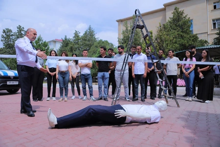 Sonra isə şərti hadisə yerinə baxış zamanı hadisə yerinin müayinə üsulları, hadisə yerində olan dəlillərin rəsmiləşdirilməsi, üzərində aşkar olunan əl-barmaq və digər izlərinin fiksasiya edilməsi, götürülməsi və rəsmiləşdirilməsi qaydası, həmçinin canlı şəxsin və meyitin əl-barmaq izlərinin götürülməsi əyani olaraq tələbələrə izah olunub.