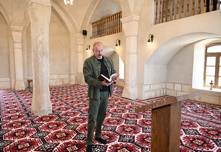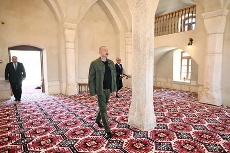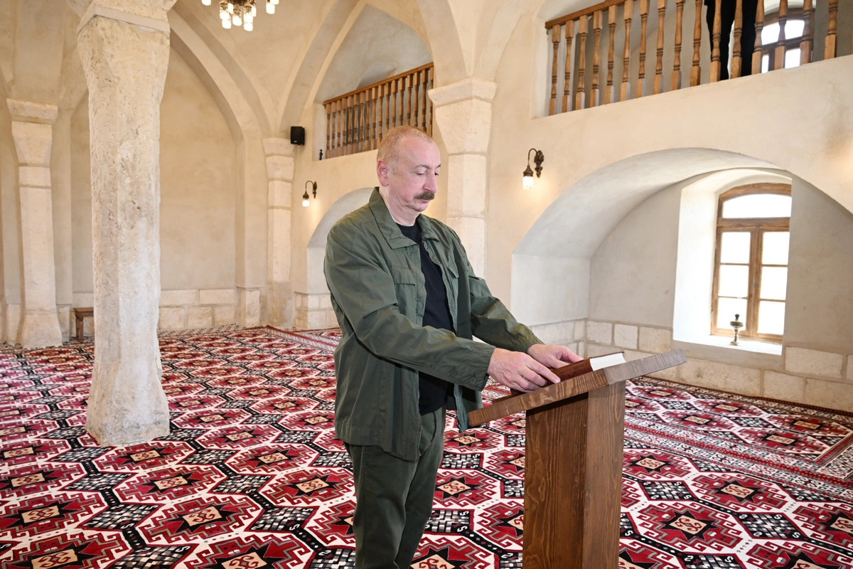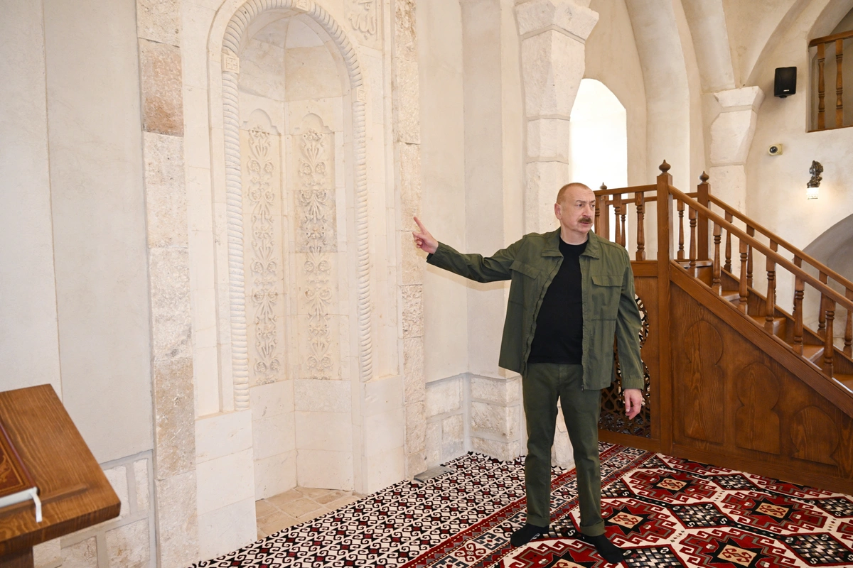İlham Əliyev Ağdamın Qiyaslı kəndindəki tarixi məscidin binasının bərpadan sonra açılışında iştirak edib