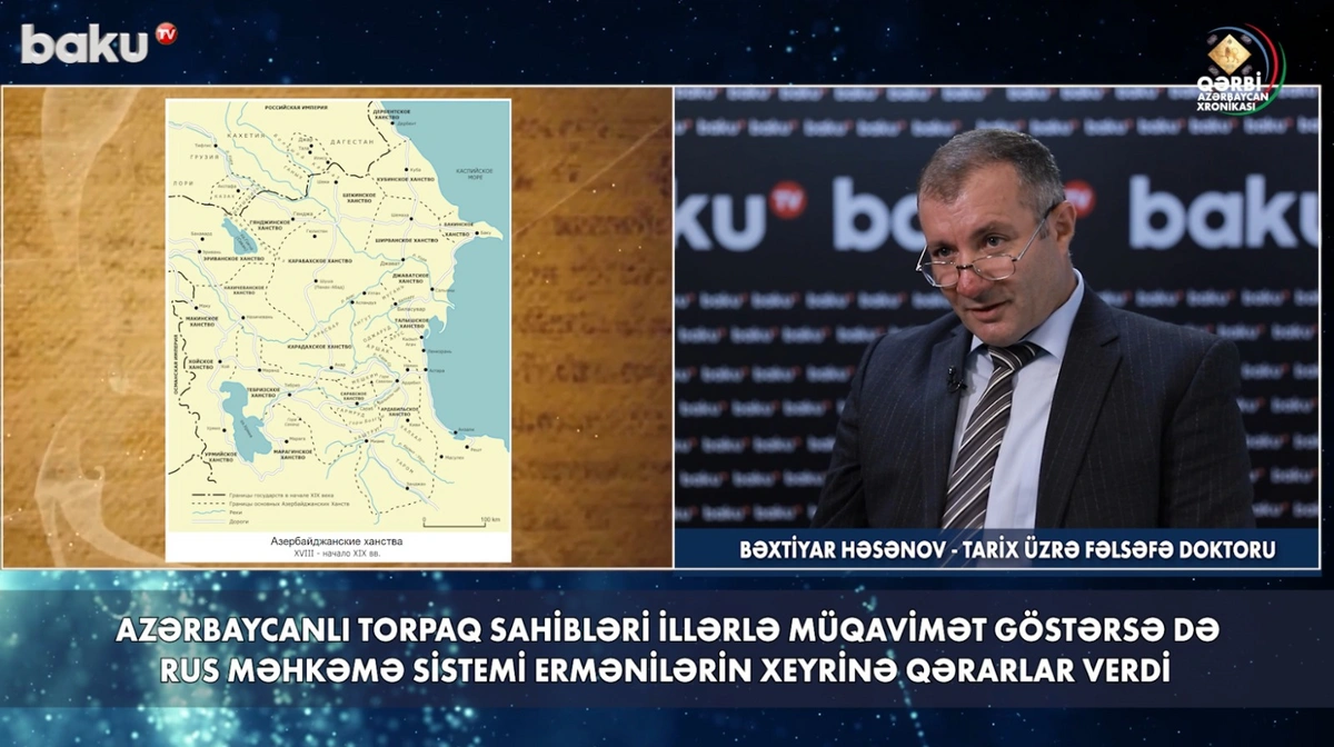 “Report” xəbər verir ki, verilişdə tarix üzrə fəlsəfə doktoru Bəxtiyar Həsənov hayların 19-cu əsrdə Qərbi Azərbaycana köçürülməsindən sonra Azərbaycan mülkədarlarına məxsus torpaqların məhkəmə qərarları ilə əllərindən alınıb ermənilərə verilməsindən bəhs edir.