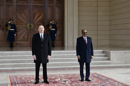 Azərbaycanda rəsmi səfərdə olan Somali Prezidenti Hasan Şeyx Mahmudun fevralın 12-də rəsmi qarşılanma mərasimi olub.