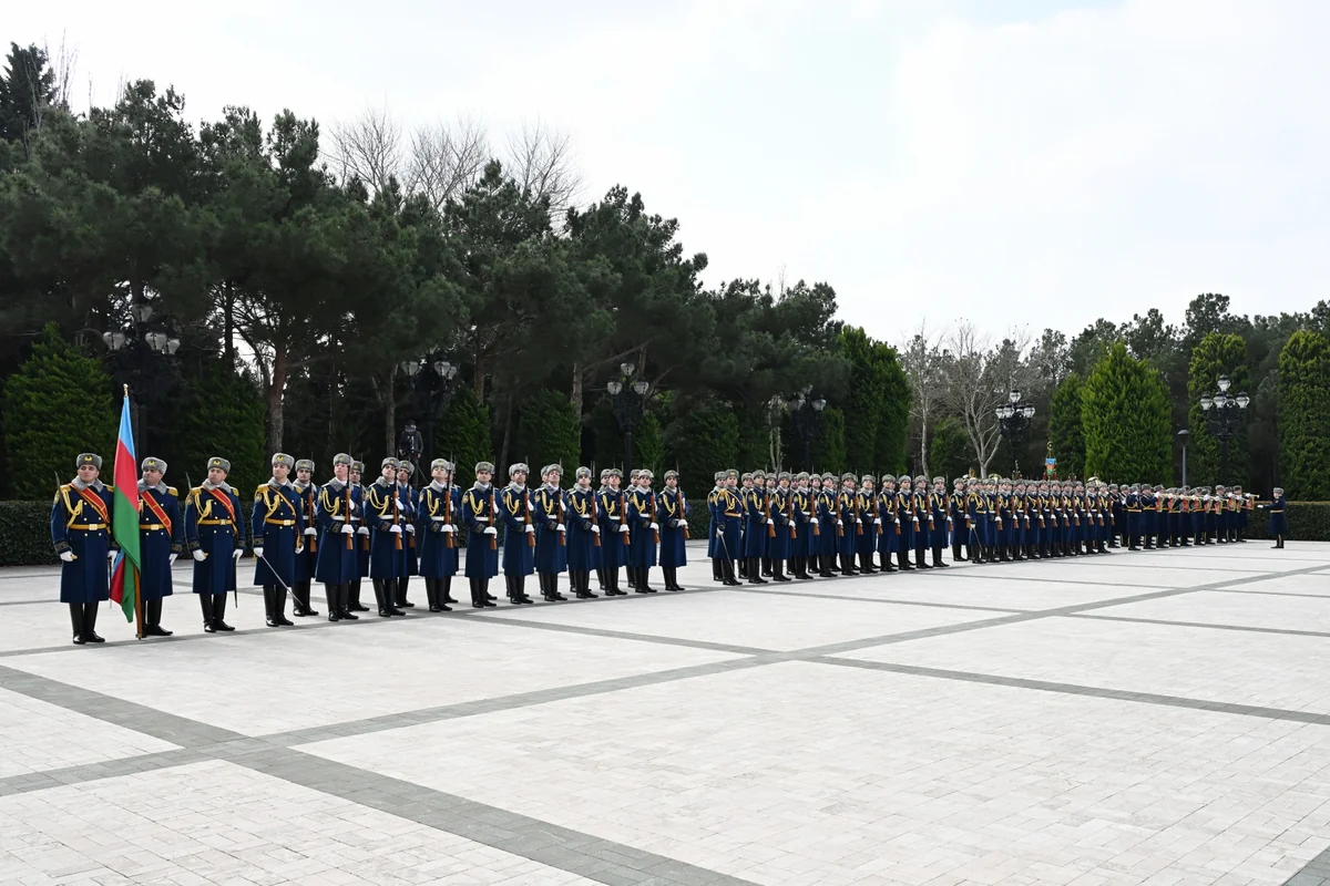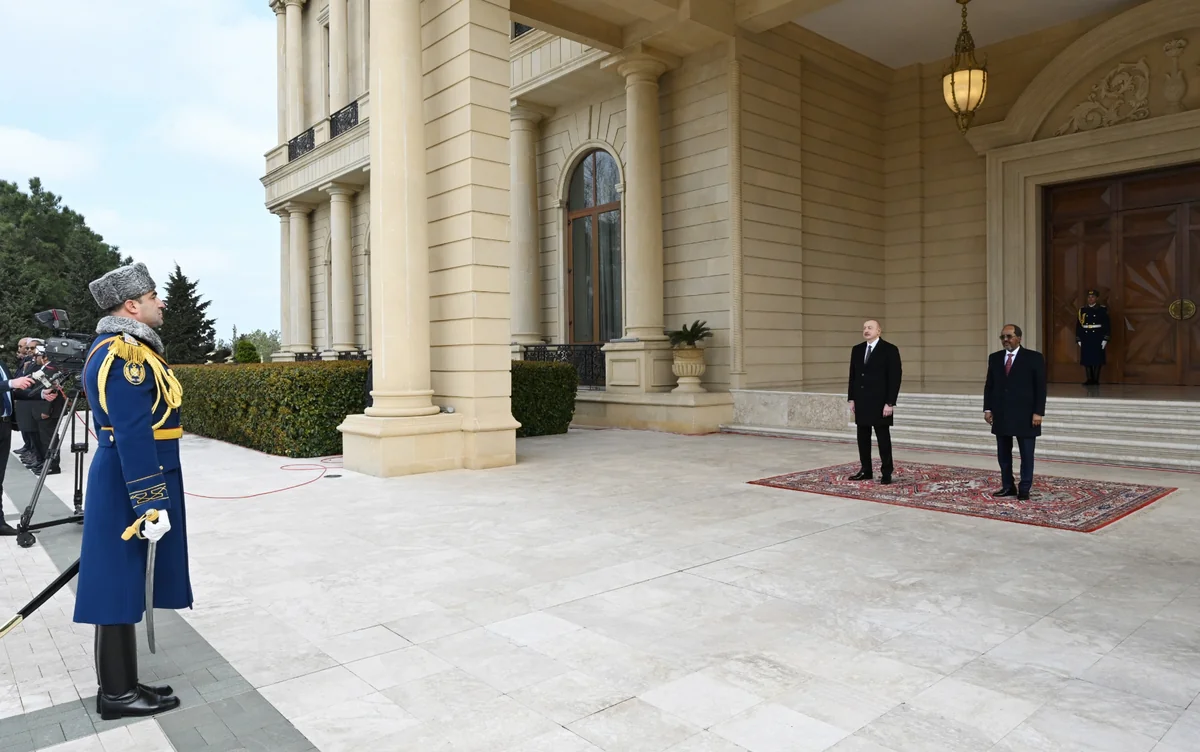 Fəxri qarovul dəstəsi hərbi marşın sədaları altında Azərbaycan Prezidenti İlham Əliyevin və Somali Prezidenti Hasan Şeyx Mahmudun qarşısından keçib.