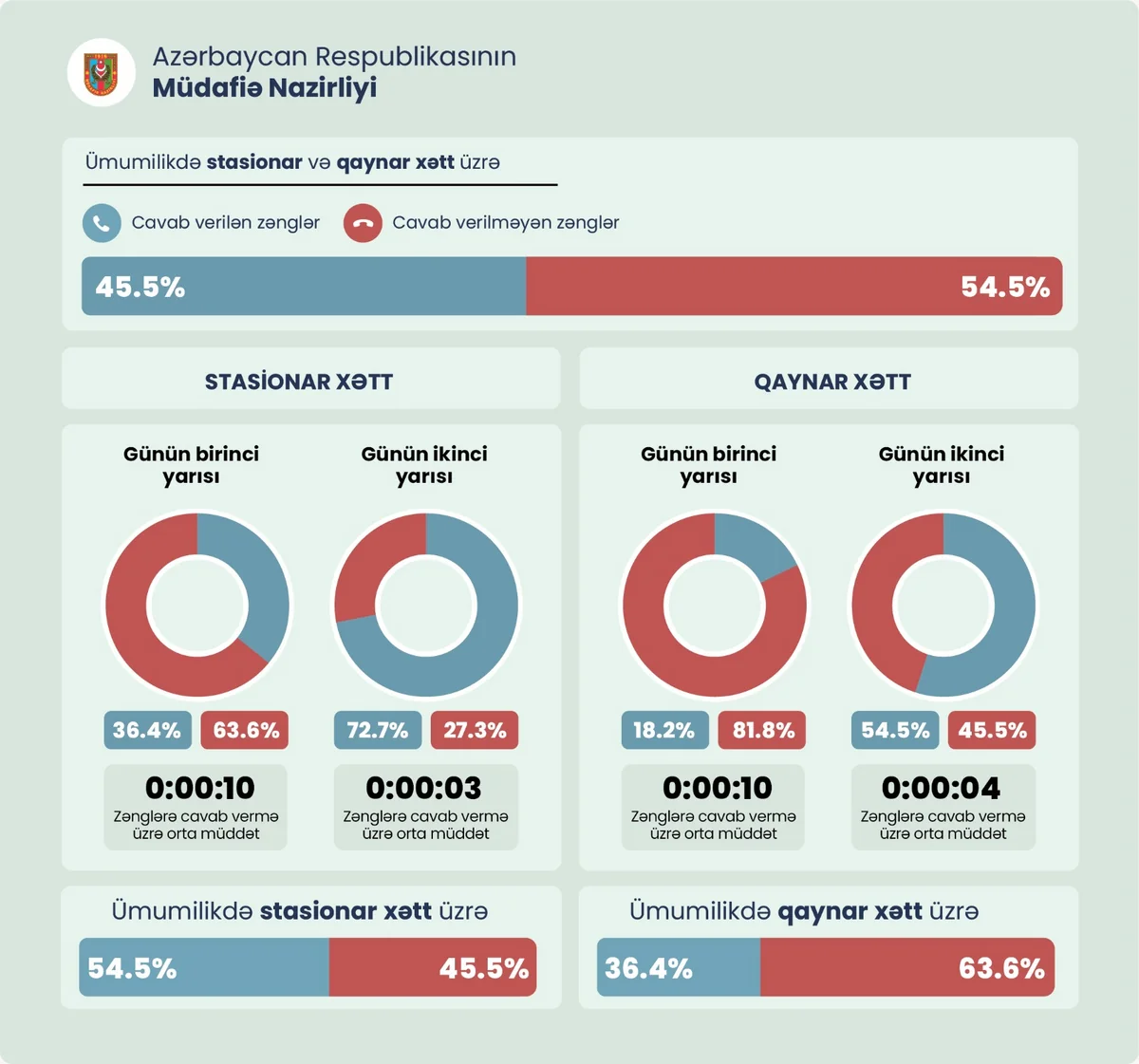 Müdafiə Nazirliyinin stasionar nömrəsinə günün birinci və ikinci yarısında edilən zənglərin 54,5%-nə cavab verilib, 45,5%-nə cavab verilməyib. Günün birinci yarısında stasionar əlaqə vasitəsi üzrə zənglərə cavab vermədə orta müddət 10 saniyə, günün ikinci yarısında 3 saniyə olub.