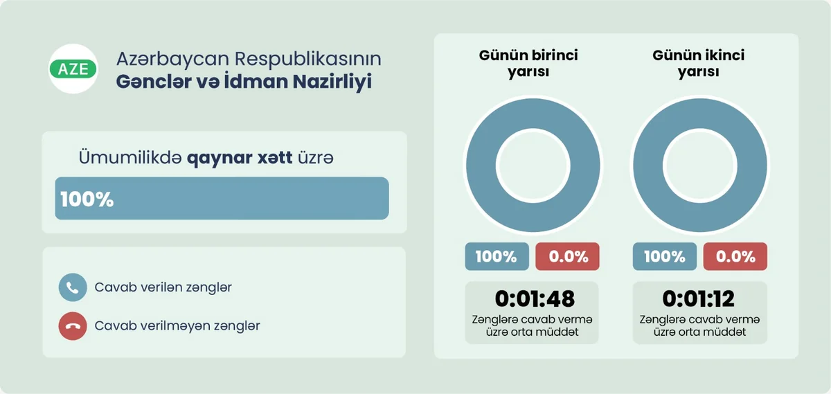Gənclər və İdman Nazirliyinin qaynar xəttinə (stasionar nömrəsi yoxdur) günün birinci və ikinci yarısında edilən bütün zənglərə cavab verilib. Günün birinci yarısında zənglərə cavab vermədə orta müddət 1 dəqiqə 48 saniyə, günün ikinci yarısında 1 dəqiqə 12 saniyə olub.
