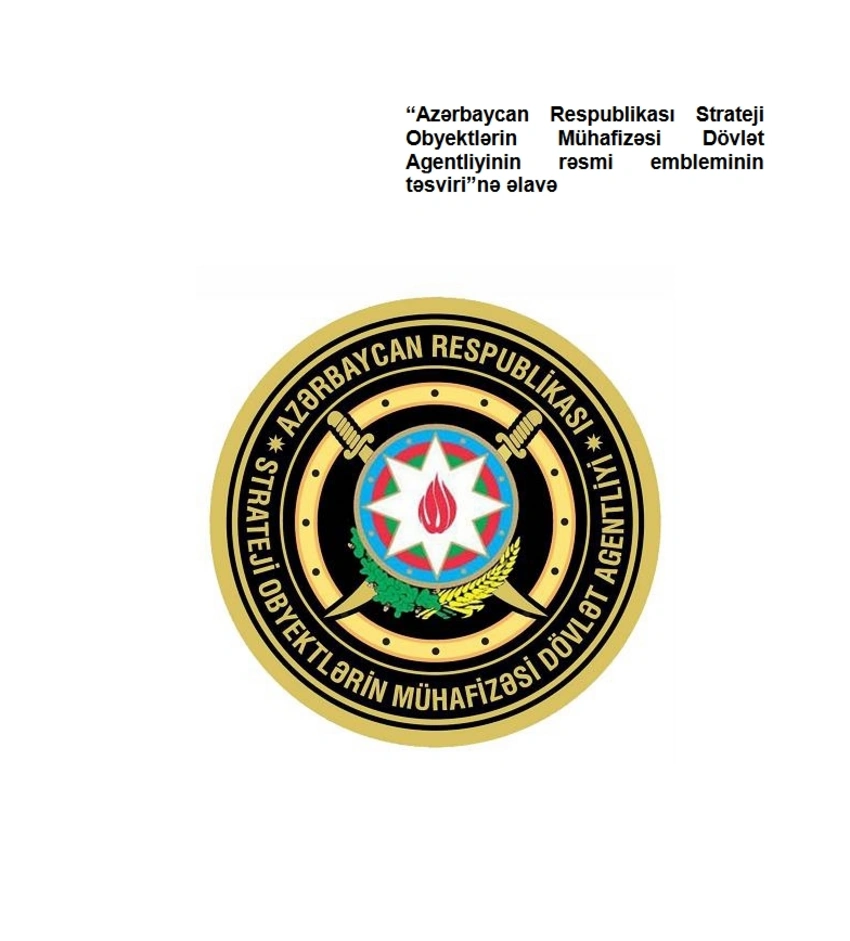 Fərmanla, həmçinin “Azərbaycan Respublikası Strateji Obyektlərin Mühafizəsi Dövlət Agentliyinin rəsmi embleminin təsviri” də təsdiqlənib (əlavə olunur).