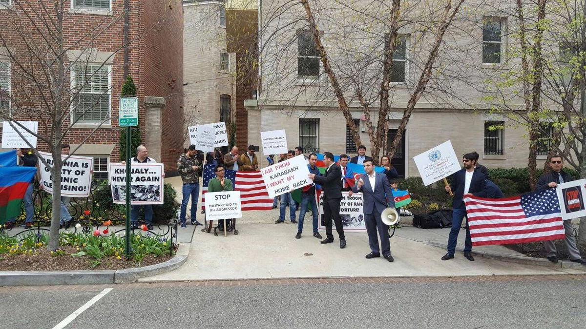Bakı. 4 aprel. REPORT.AZ/ Amerika Birləşmiş Ştatlarının paytaxtı Vaşinqton şəhərində yaşayan Güney və Quzeydən olan azərbaycanlıların bir qrupu Ermənistanın ABŞ-dakı səfirliyi qarşısında etiraz aksiyası keçiriblər.