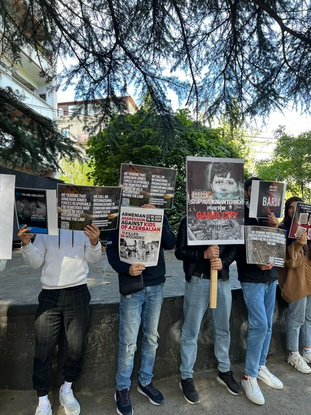 “Biz çoxsaylı hərbi cinayətlərə görə məsuliyyət daşıyan erməni silahlı qüvvələrinin qanun qarşısında cavab verməsini tələb edirik!”, “Erməni təcavüzünü dayandırın!”, “Uşaqların öldürülməsini dayandırın!”, “Erməni vandallığını dayandırın!”, “Gəncə üçün dua et!”, “Erməni terrorunu dayandır!”, “Erməni silahlı qüvvələri təkcə Azərbaycan hərbi qulluqçularına deyil, dinc əhaliyə də qarşı misli görünməmiş qırğınlar törədib!”, “Azərbaycan torpaqlarında erməni əsgərlərinə YOX!”, “Ermənistan, bizim torpaqlarımızın minalandırılmasını dayandır!”, “Biz beynəlxalq təşkilatları Ermənistanın hərbi cinayətlərini pisləməyə çağırırıq!” və s. şüarlarının əks olunduğu plakatlar vasitəsilə aksiya iştirakçıları beynəlxalq təşkilatlardan və dünya ictimaiyyətindən Ermənistanın hərbi cinayətlərinə münasibət bildirilməsini tələb ediblər.