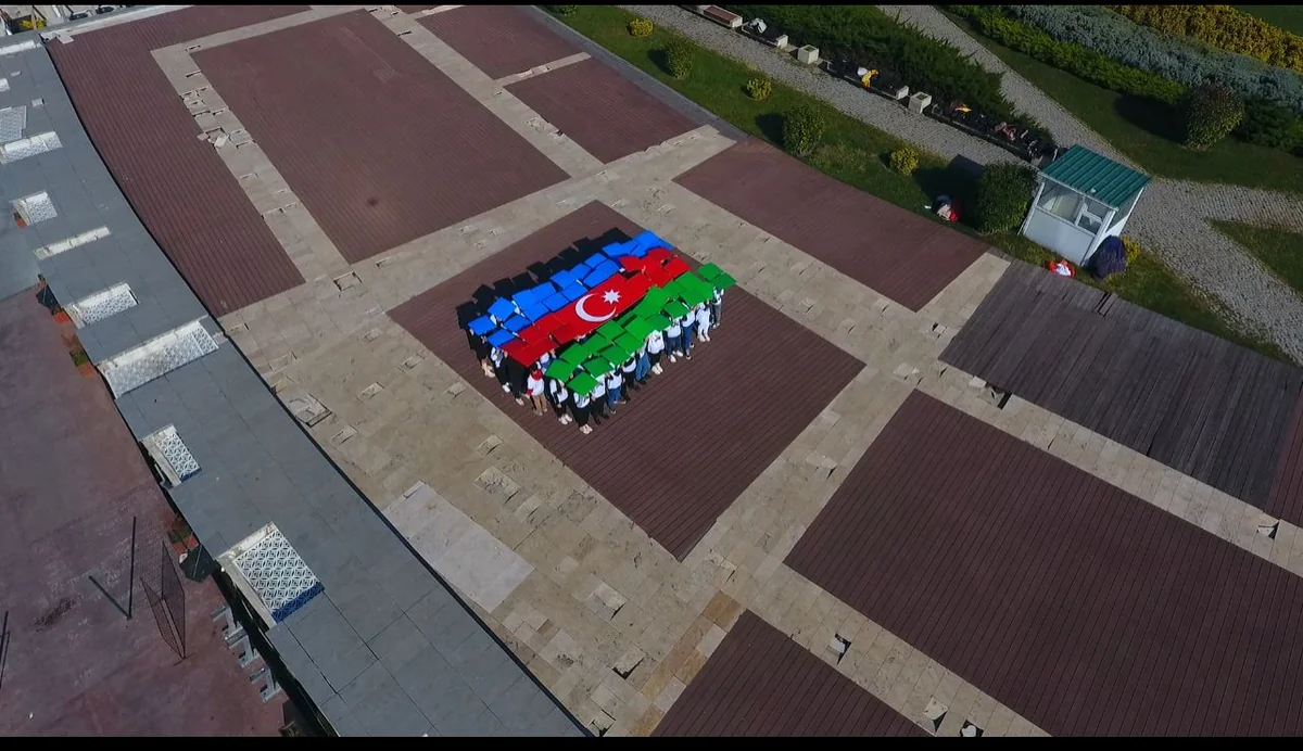 Üzərində Zəfər bayramının və Şuşanın simvolu - Xarı bülbülün təsviri olan ağ köynək geyinmiş 60 gənc göy, qırmızı, yaşıl rəngli, aypara və səkkizguşəli ulduzun yer aldığı lövhələrdə Azərbaycanın dövlət bayrağının təsvirini yaradıblar.