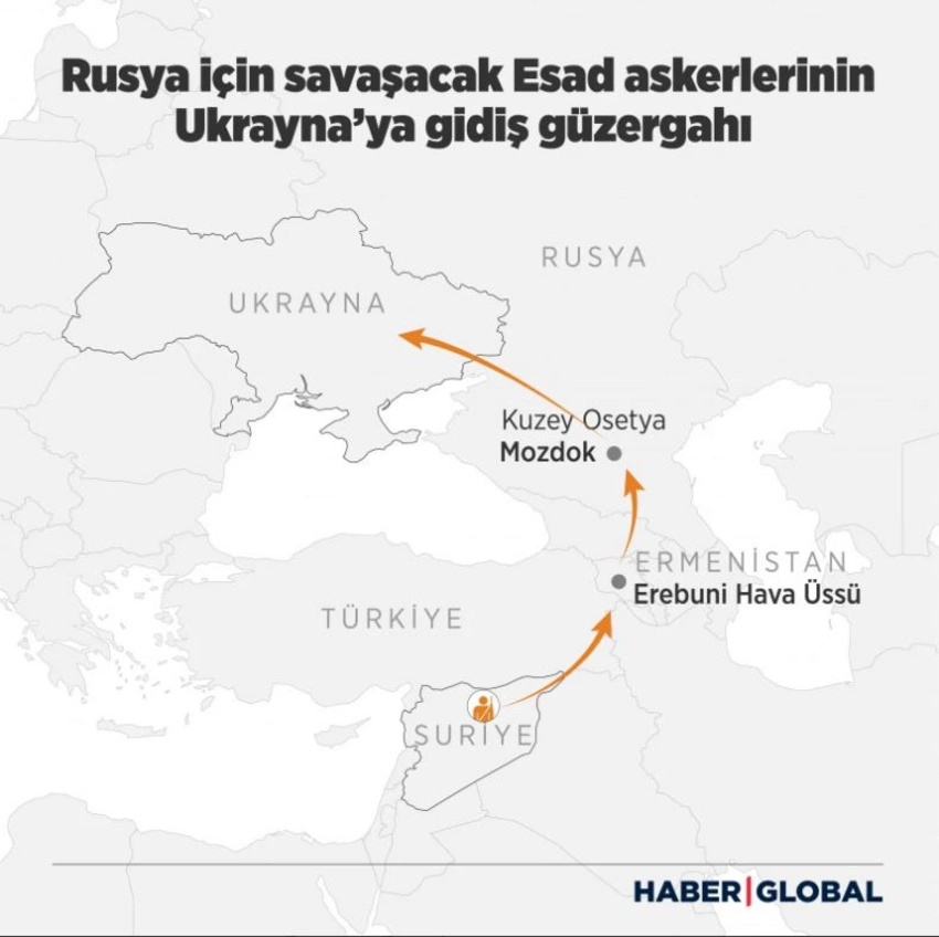 "Report" "HaberGlobal"a istinadən xəbər verir ki, mənbə Bəşər Əsədin Rusiyaya göndərdiyi muzdluların Ukraynaya marşrutunu da açıqlayıb.