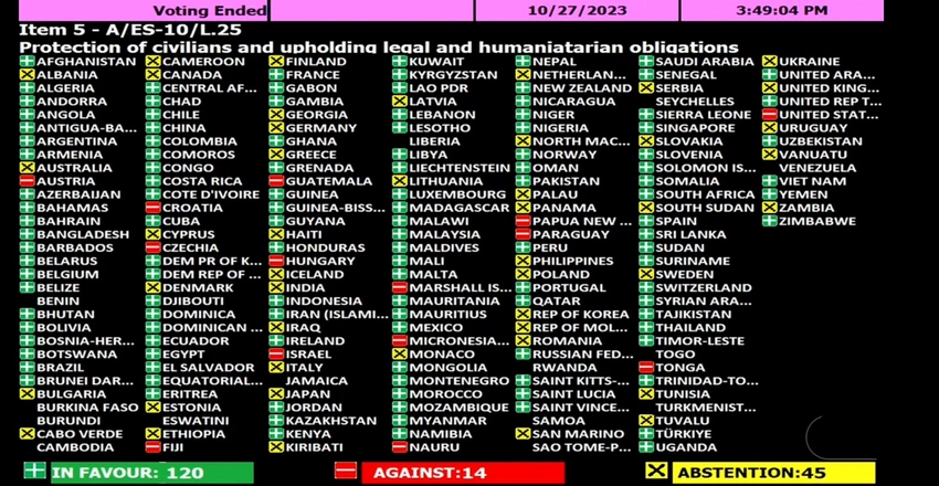 Qətnamə layihəsinin qəbulunda 120 ölkə "hə”, 14 ölkə "xeyr" səsini verib; 45 ölkə səsvermədə iştirak etməyib.