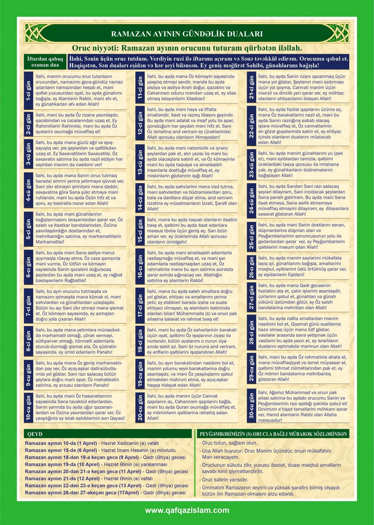 Qeyd edək ki, mərhəmət və şəfqət ayı olan müqəddəs Ramazan ayı ərzində iftar süfrələri açmaq, yardım və xeyriyyəçilik etmək, ehtiyacı olanlara, kimsəsiz insanlara, uşaq evlərinə, ahıl və qocalara imkan daxilində köməklik göstərmək Allah nəzərində bəyənilən əməllərdəndir. Quran tilavəti, valideynlərin qayğısına qalmaq, dünyasını dəyişənlərin ruhlarını yad etmək, elm-irfan və ibadətlə məşğul olmaq bu ayda ən böyük savab əməllərdən sayılır.