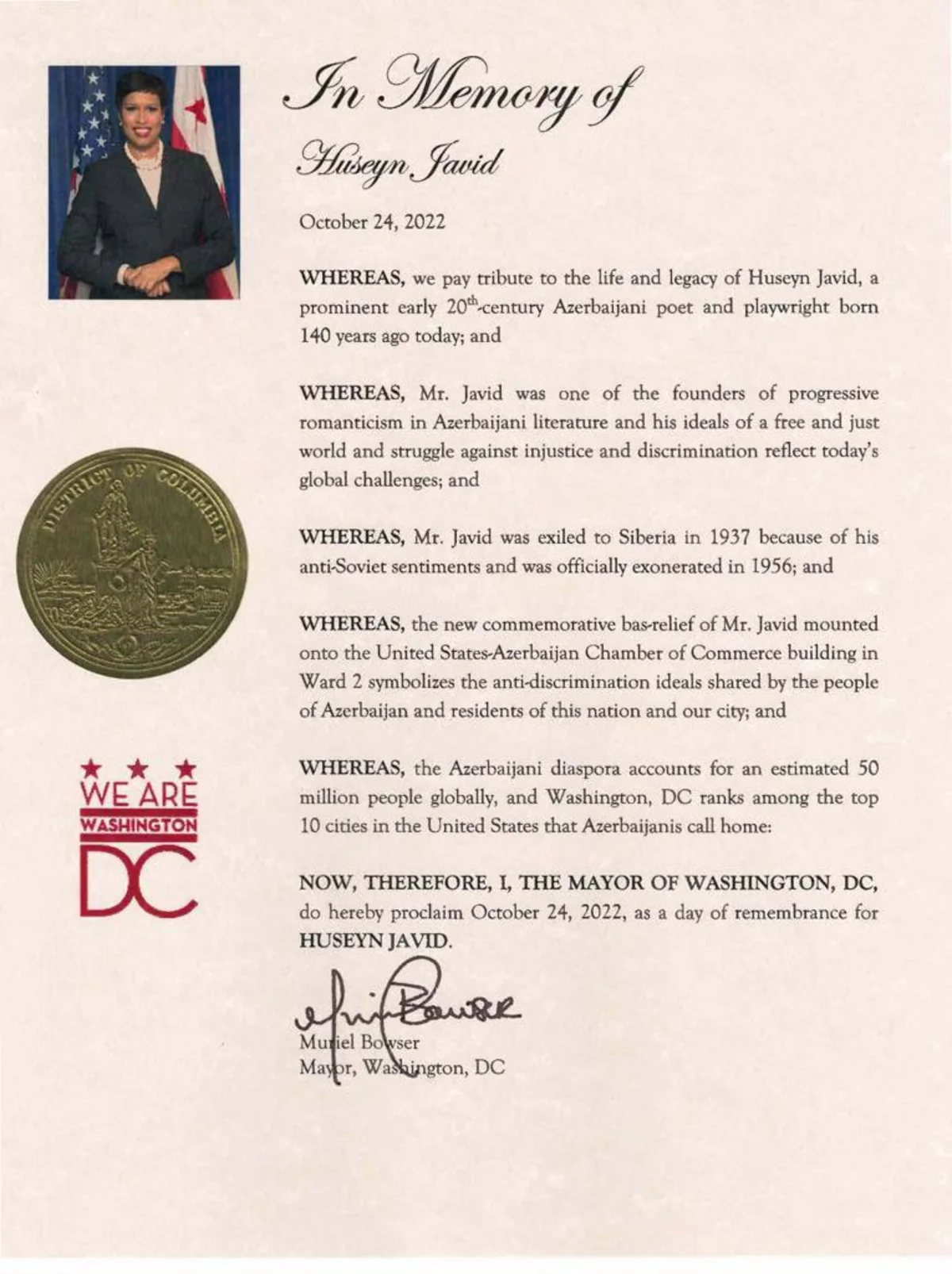 “Bütün bunları nəzərə alaraq, mən - Vaşinqton şəhərinin meri 24 oktyabr 2022-ci il tarixini Hüseyn Cavidin xatirə günü elan edirəm”, - Muriel Bauzer qeyd edib.