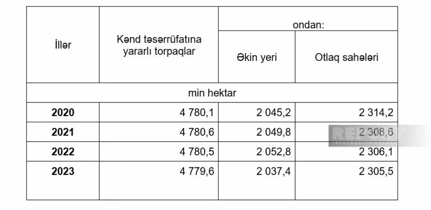 Dövlət Statistika Komitəsindən "Report"un sorğusuna cavab olaraq verilən məlumata görə, 2020-ci ildə 4 780,1 min hektar olan bu torpaq sahələri 2023-cü ildə 4 779,6 min hektara enib.