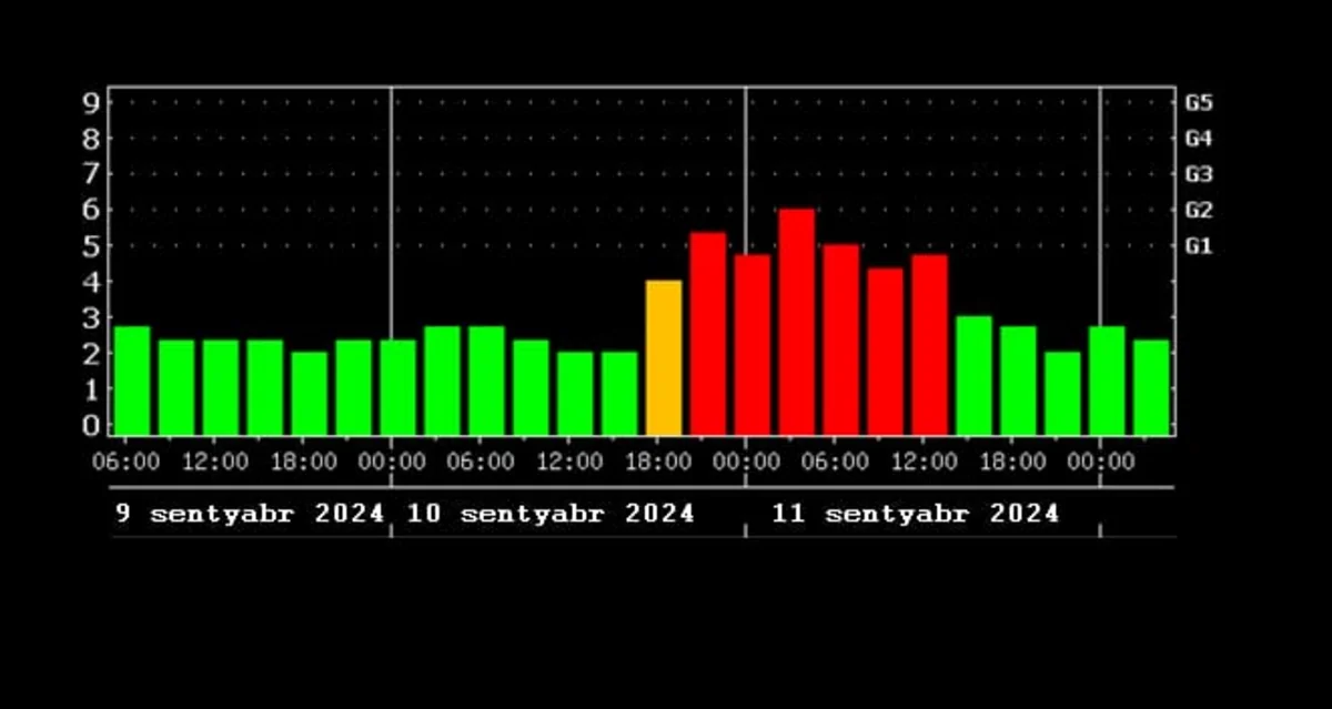 Qeyd olunub ki, hazırda geomaqnit qasırğası orta səviyyədədir: "Sentyabrın 10-u saat 17:00 radələrindən başlayaraq geomaqnit qasırğa G1 (mülayim) səviyyəsinə yüksələcək, sentyabrın 10-u gecə və 11-i səhər saat 06:00 radələrində G2 (orta) səviyyədə olacaq. Sentyabrın 11-i saat 13:00 radələrindən başlayaraq geomaqnit sahə normal fon səviyyəsinə düşəcək. Geomaqnit qasırğa daha çox yüksək coğrafi enliklərdə müşahidə olunacaq. Orta coğrafi enliklərdə isə mülayim olaraq hiss ediləcək".