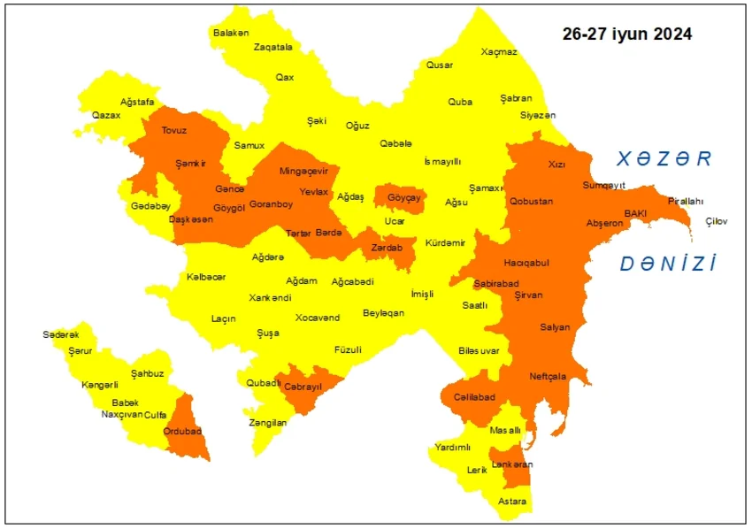 İyunun 26-27-də ölkənin bəzi rayonlarında gözlənilən küləkli hava şəraiti ilə bağlı sarı və narıncı xəbərdarlıq edilib.