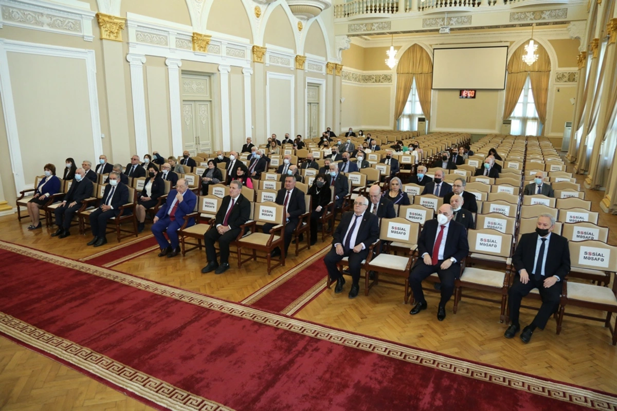 AMEA-nın prezidenti vəzifəsindən istefa verən Ramiz Mehdiyev də yığıncaqda iştirak edir.