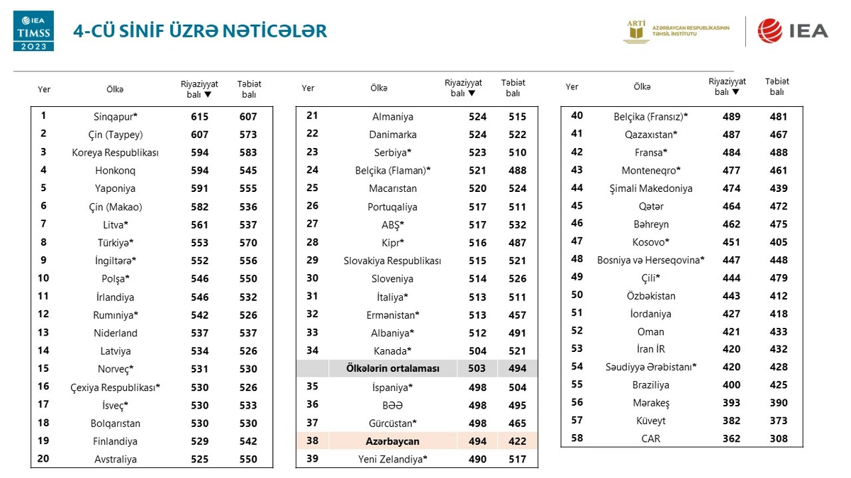 Qeyd edilib ki, Azərbaycan 4-cü sinif riyaziyyat fənni üzrə 494 balla 58 ölkə arasında 38-ci yerdə qərarlaşıb. Təbiət elmləri üzrə nəticə isə 422 bal olub. Bu nəticələr ötən tədqiqat dövrü ilə müqayisədə daha aşağıdır. Azərbaycanın 4-cü sinif üzrə riyaziyyat nəticələri Fransa, Belçika (Fransız), Yeni Zelandiya, Qazaxıstan, Qətər və Özbəkistan kimi ölkələrdən daha yaxşı olub.
