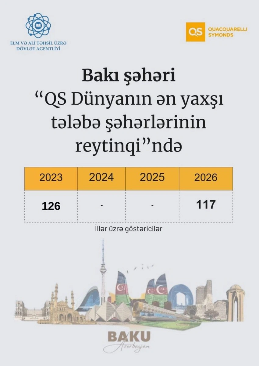 Dünyanın ən nüfuzlu reytinq agentliklərindən biri olan “Quacquarelli Symonds” tərəfindən 2026-cı il üçün dünyanın ən yaxşı tələbə şəhərlərinin reytinqi elan olunub.