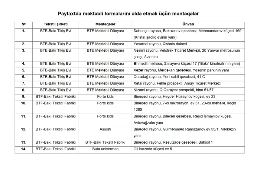 Valideynlər paytaxt üzrə məktəbli formalarını 18 məntəqədən əldə edə bilərlər.