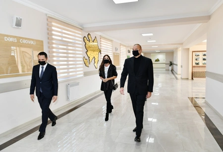 Dövlət başçısı, birinci xanım və qızları yeni məktəbin sinif otaqlarını, fənn kabinetlərini gəziblər.