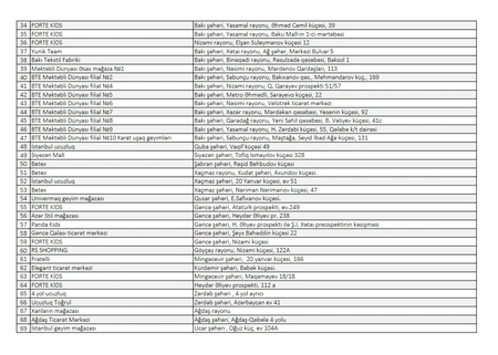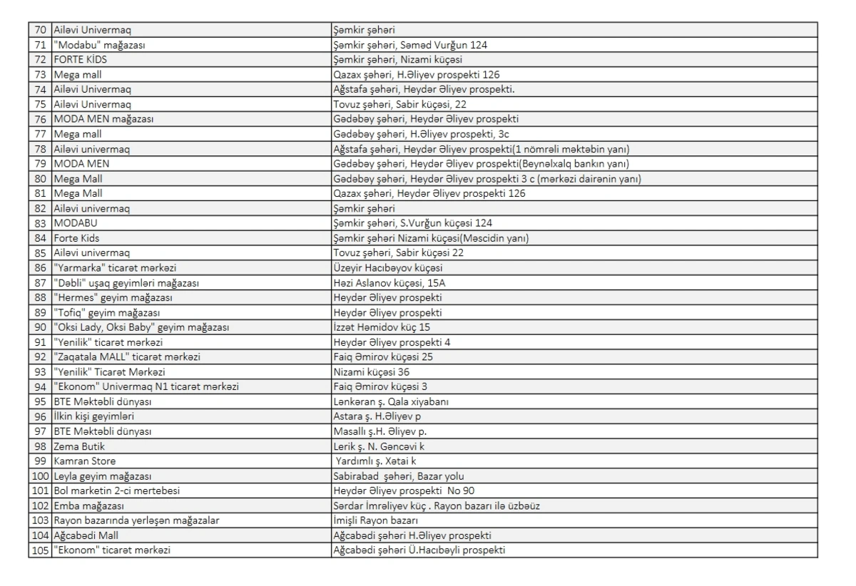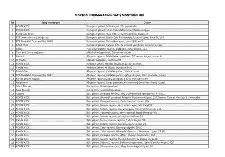 "Report" Agentliyə istinadən xəbər verir ki, vahid məktəbli geyimlərinin əldə edilməsinin asanlaşdırılması, əlçatanlığın təmin edilməsi məqsədi ilə vətəndaşlar aşağıda qeyd edilən, eləcə də ölkənin şəhər və rayonlarında fəaliyyət göstərən istənilən satış məntəqələrinə müraciət edə bilərlər.
