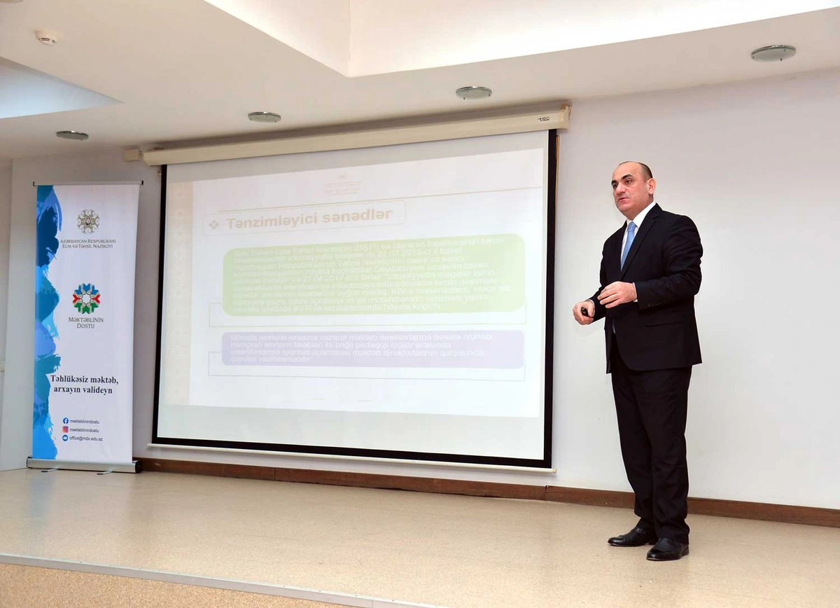 Məktəb və müəllimin ictimai nüfuzunun qorunması, fəaliyyətin təqdim olunması, qarşılıqlı əməkdaşlıq imkanlarının artırılması məsələlərindən bəhs olunan təlimdə BŞTİ-nin İctimaiyyətlə əlaqələr sektorunun müdiri Bəşarət Məmmədov “Məktəblinin dostu” layihəsinin əməkdaşlarının bu istiqamətdə verdiyi dəstəyə görə təşəkkürünü bildirib.