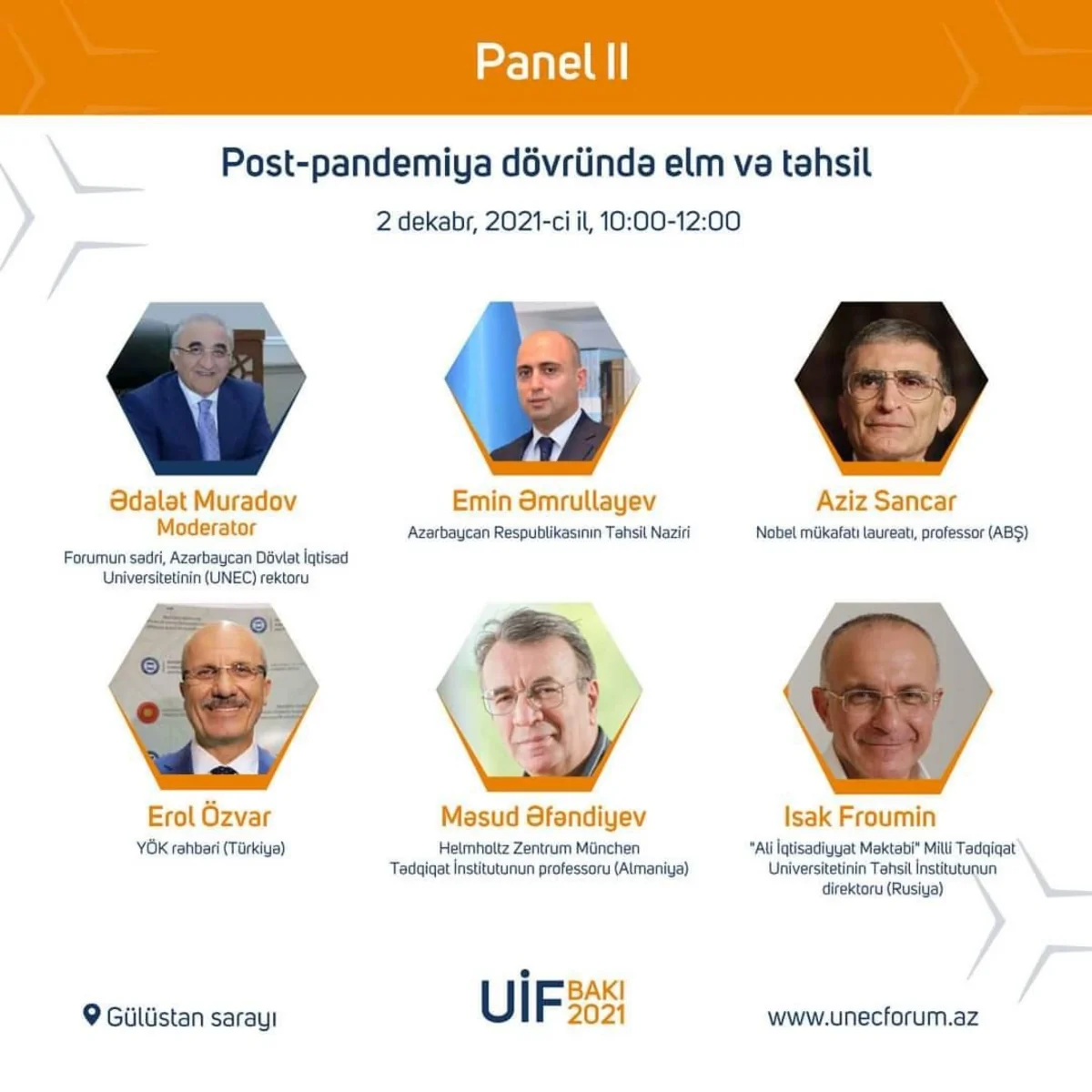 Rektor qeyd edib ki, UNEC İqtisadi Forumunda iştirak etmək üçün Bakıya gələn Əziz Səncəri özü qarşılayıb: “Forum çərçivəsində Əziz Səncərin iştirakı ilə çox faydalı görüşlər (o cümlədən gənc tədqiqatçılar, olimpiada qalibləri olan yuxarı sinif şagirdləri və bir qrup şəhid övladları-tələbələr və Gəncədən olan qızımız Xədicə ilə görüş), çox maraqlı müzakirələr (o cümlədən, Postcovid elm və təhsilinə elmi baxış), Şuşaya səfər və digər maraqlı tədbirlər nəzərdə tutulub. Dəvətimizi qəbul etdiyinə görə dəyərli Əziz Səncərə təşəkkür edirik”.