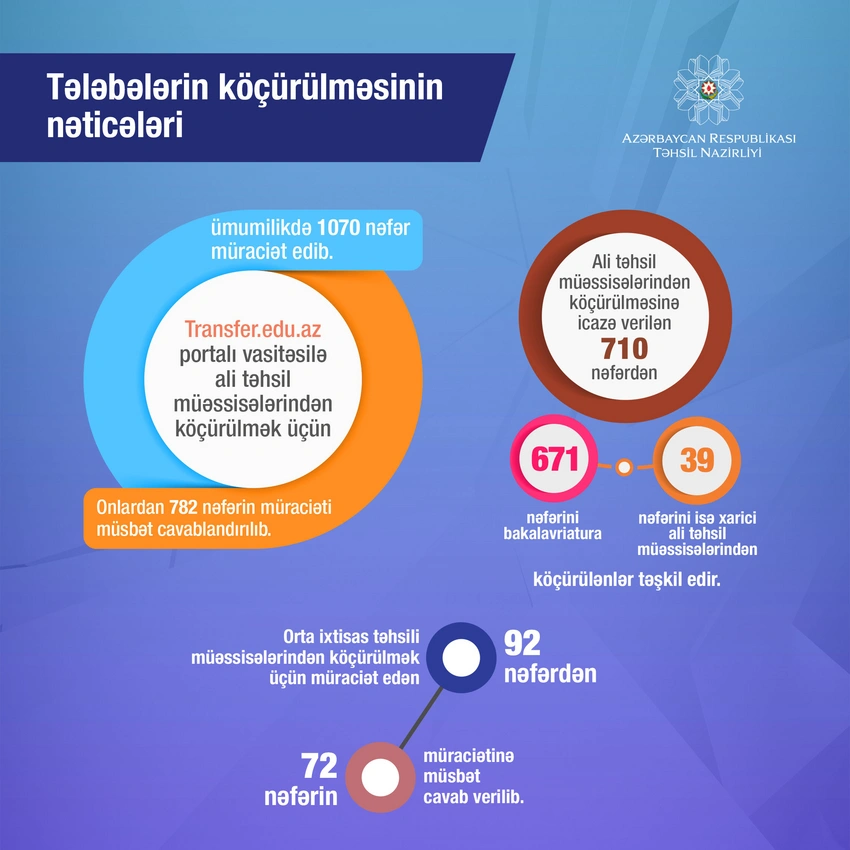 Ali təhsil müəssisələrindən köçürülməsinə icazə verilən 710 nəfərdən 671 nəfərini bakalavriatura, 39 nəfərini isə xarici ali təhsil müəssisələrindən köçürülənlər təşkil edir.