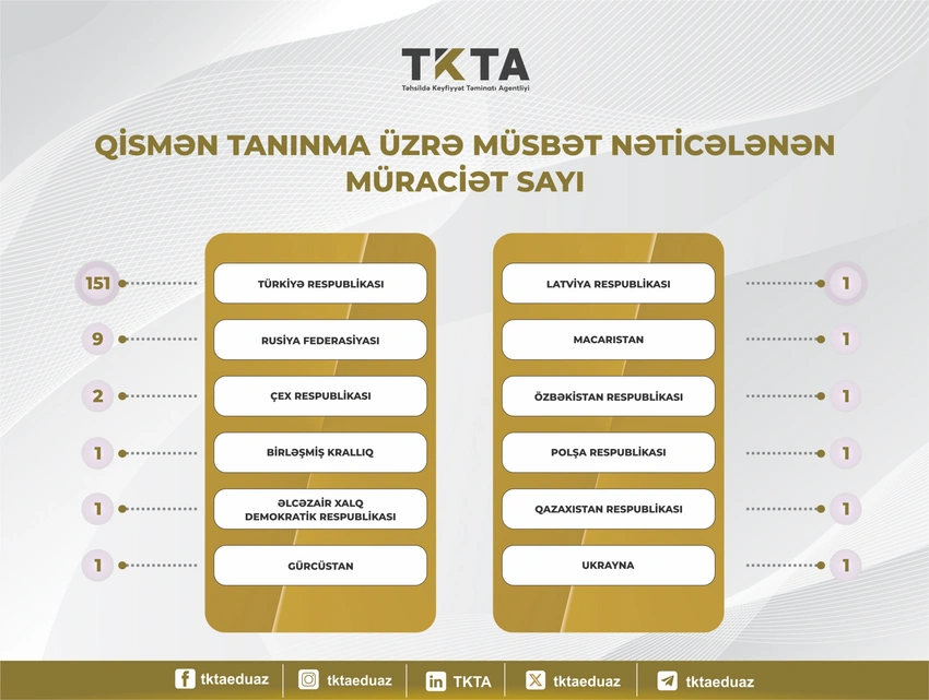 Bildirilib ki, xaricdə natamam ali təhsil alan şəxslərə şəhadətnamə əldə etmək məqsədilə müəyyən olunmuş 5 iyun-9 iyulda 192 nəfər şəxsin müraciəti qeydə alınıb. Həmin müraciətlərdən 171-i barədə müsbət qərar verilərək, qazanılmış Avropa Kredit Transferi və Toplanması Sistemi (AKTTS) sayının qeyd olunduğu müvafiq şəhadətnamələr təqdim edilib, 6 nəfərin müraciəti mənfi qərarla yekunlaşıb və 15 nəfərin sənədləri isə sənəd çatışmazlığına görə geri qaytarılıb.