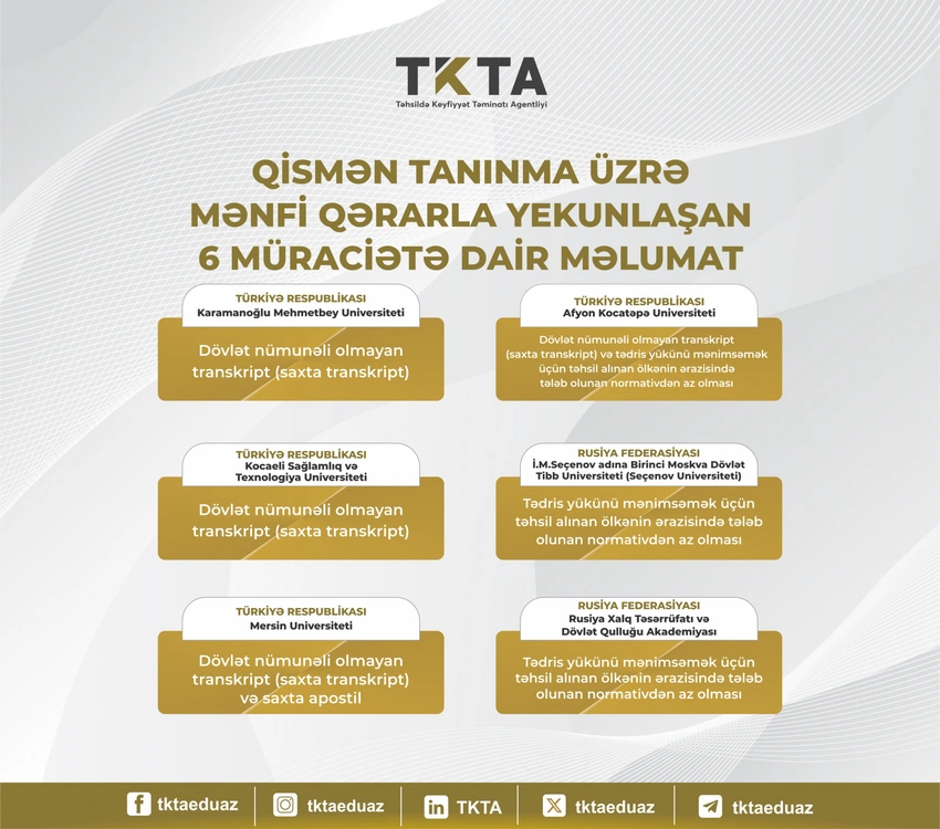 Məlumata görə, mənfi qərarla yekunlaşan müraciətlərə nümunə olaraq 2 fakt üzrə dövlət nümunəli olmayan transkript (saxta transkript), 2 fakt üzrə tədris yükünü mənimsəmək üçün təhsil alınan ölkənin ərazisində tələb olunan normativdən az olması, 1 fakt üzrə dövlət nümunəli olmayan transkript (saxta transkript) və saxta apostil, 1 fakt üzrə isə dövlət nümunəli olmayan transkript (saxta transkript) və tədris yükünü mənimsəmək üçün təhsil alınan ölkənin ərazisində tələb olunan normativdən az olması təsbit edilib.