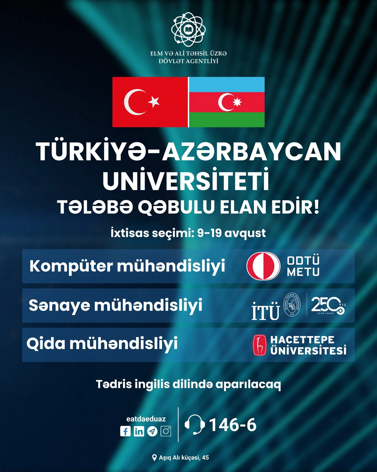Elm və Təhsil Nazirliyindən "Report"a verilən məlumata görə, Türkiyə-Azərbaycan Universiteti 2024-2025-ci tədris ili üçün kompüter mühəndisliyi, sənaye mühəndisliyi və qida mühəndisliyi ixtisasları üzrə tələbə qəbulu elan edir. Abituriyentlər 9-19 avqust tarixlərində ixtisas seçimində iştirak edərək qeyd olunan ixtisasları seçə bilərlər.